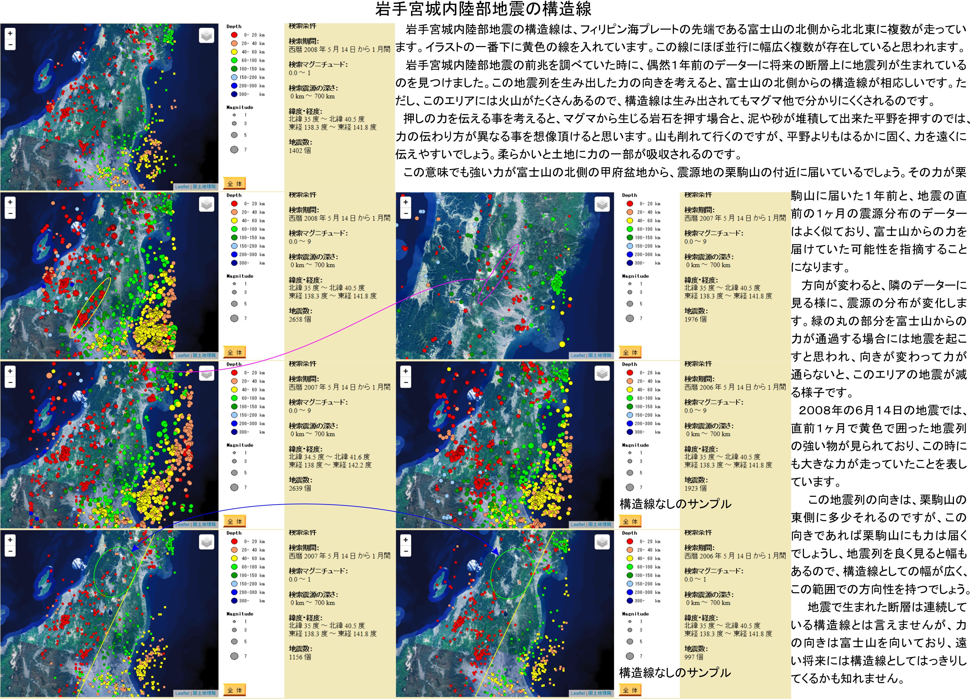 岩手宮城内陸部地震の前兆を調べていた時に、偶然1年前のデーターに将来の断層上に地震列が生まれているのを見つけました。この地震列を生み出した力の向きを考えると、富士山の北側からの構造線が相応しいです。ただし、このエリアには火山がたくさんあるので、構造線は生み出されてもマグマ他で溶岩として覆われることが多く、分かりにくくされるのです。