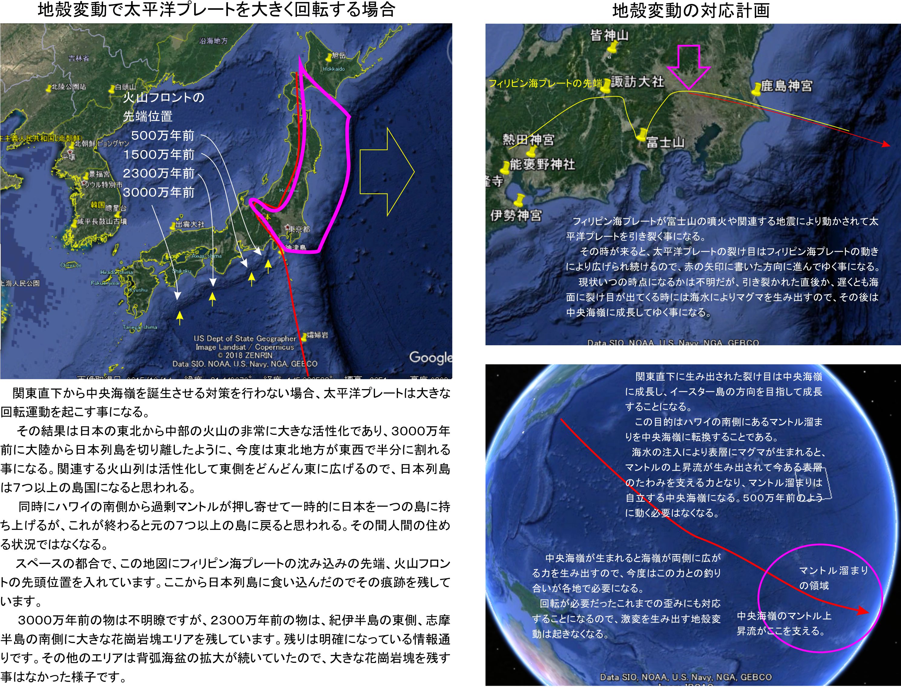 これまでに何度も書いている地殻変動対策として、関東直下から中央海嶺を誕生させる対策を行わない場合、太平洋プレートは大きな回転運動を起こす事になります。