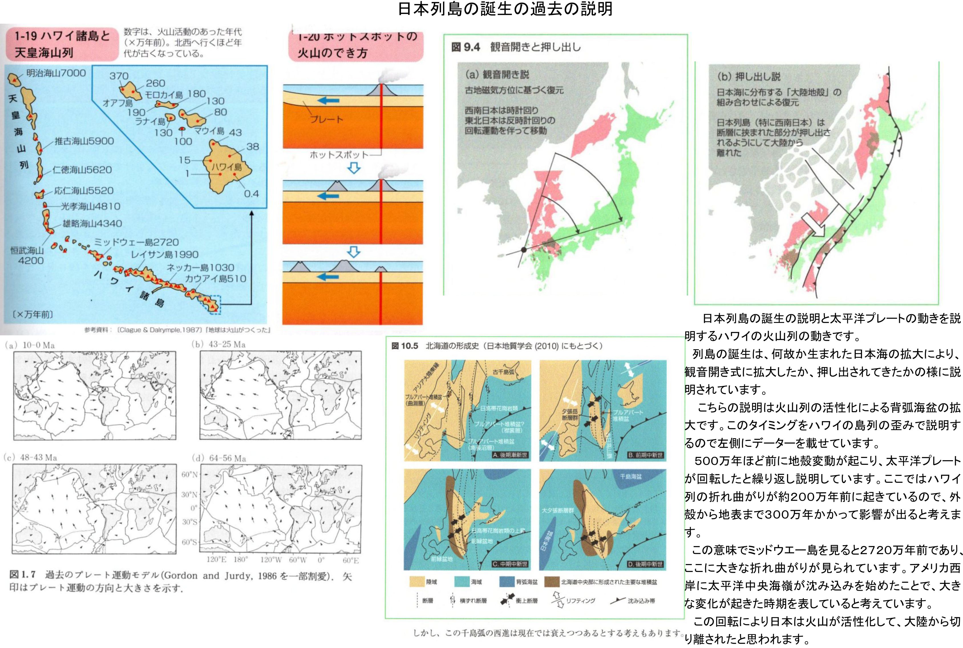 こちらの説明は、日本列島を生み出したのは火山列の活性化による背弧海盆の拡大です。大陸から火山列の活性化により、日本列島が切り出されるイメージです。このタイミングをハワイの島列の歪みで説明するので、イラストの左側に年代が分かるデーターを載せています。