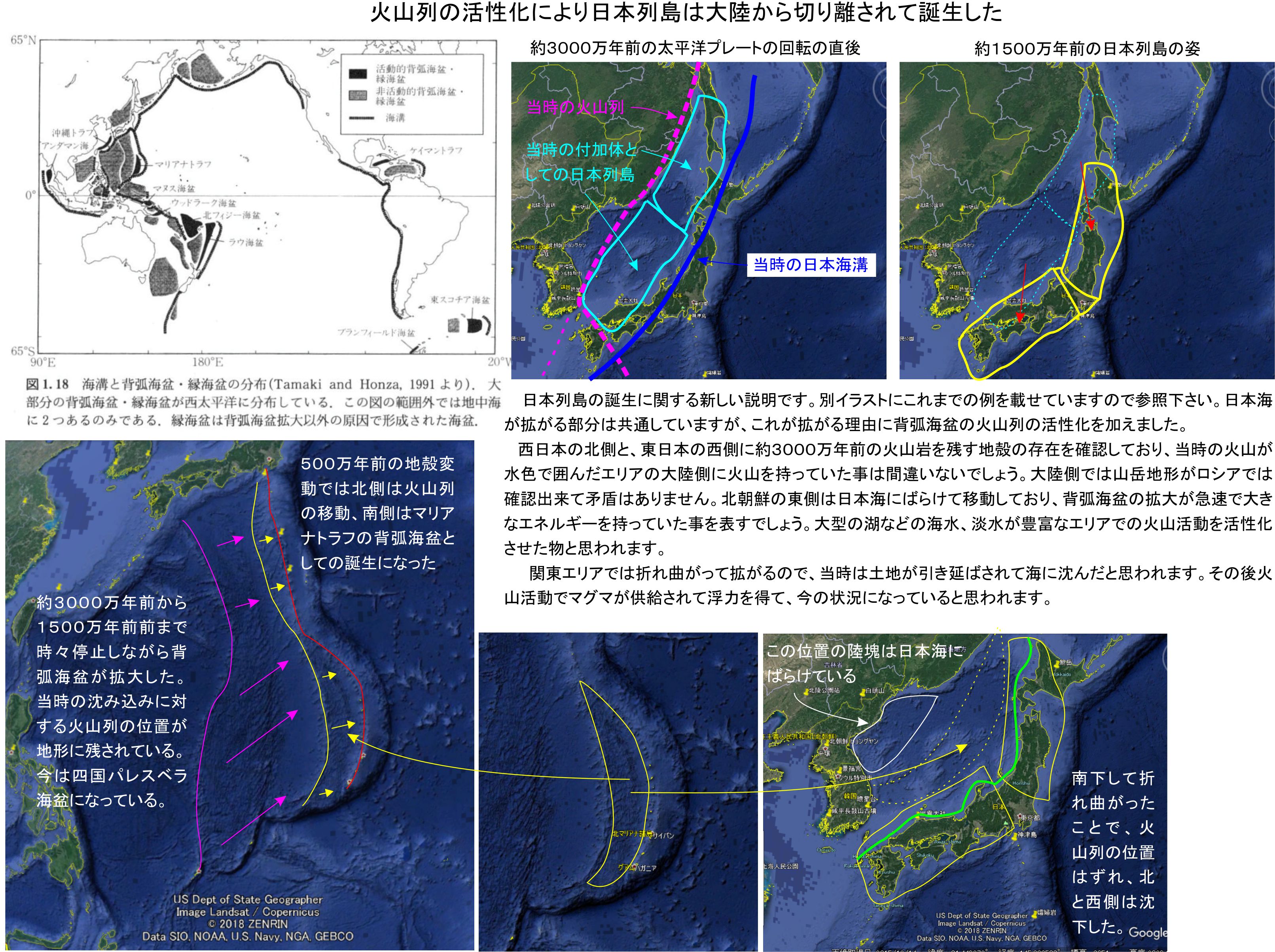 百万年単位の誤差で語るしかまだ出来ない状況ですが、太平洋中央海嶺が米国東海岸に沈み込んだ時期に日本列島は火山列により大陸から切り離されて、その後のガラパゴス諸島の大きく発達した時期に、日本海を大きく広げて今の形に近づいたのだと思います。それぞれが太平洋プレートを大きく回転させたイベントの発生であり、その影響を受けて背弧海盆が生み出されているのでした。