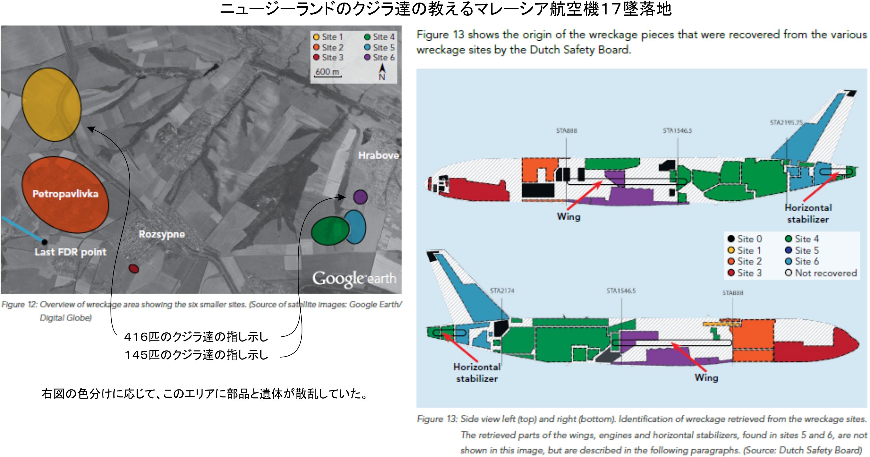 この中で紫の場所が145匹のクジラ達の指し示す場所で、ここには被害者の遺体も多かったと思われます。これに対して416匹の悲しいクジラ達の指し示す位置は複数で、黄色の位置が61とMICOの二乗算が組み込まれた場所です。位置を知っているのでこの組み込みが可能であると考えて下さい。オランダの事故報告書も見て確認していると思われます。