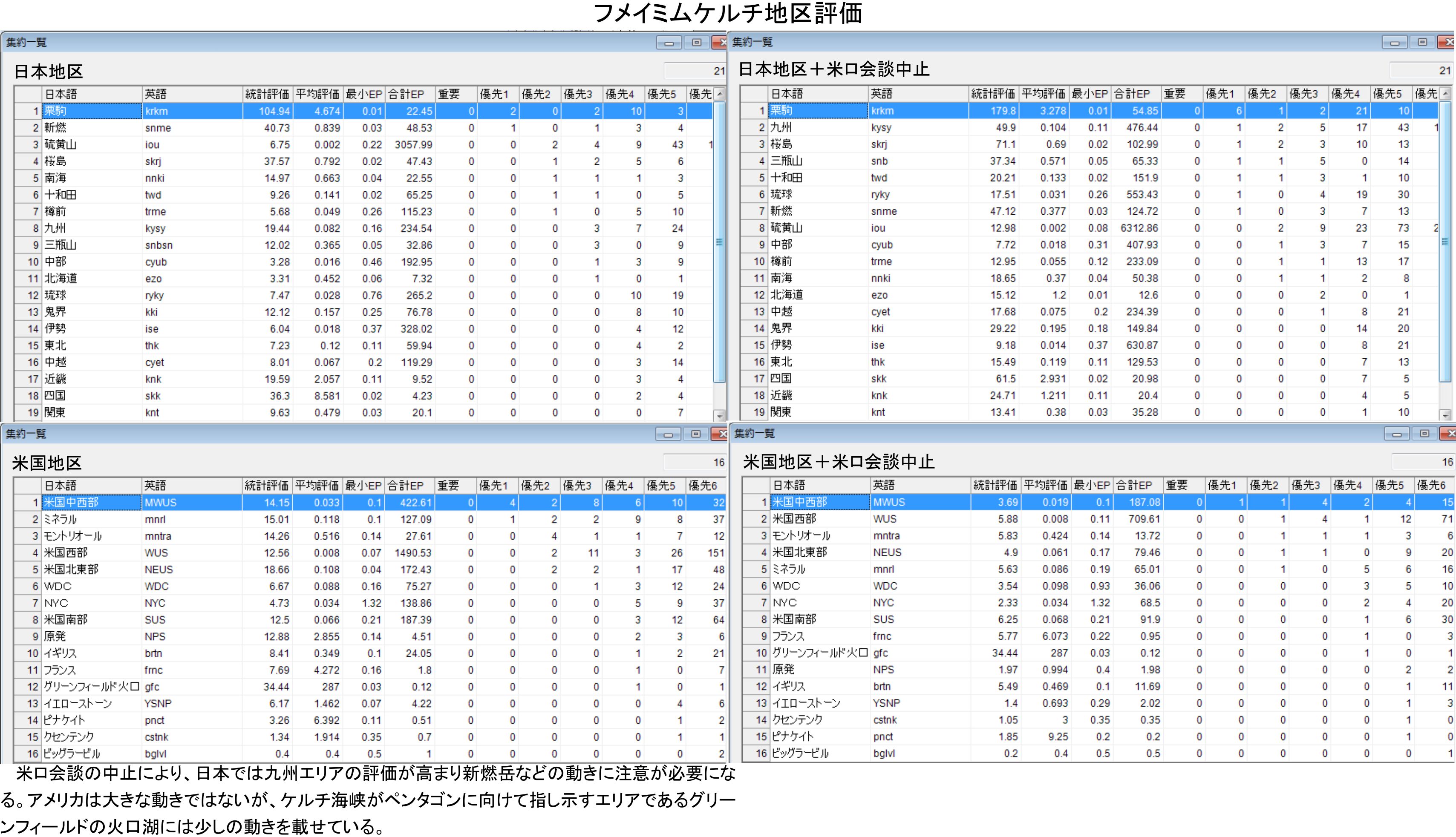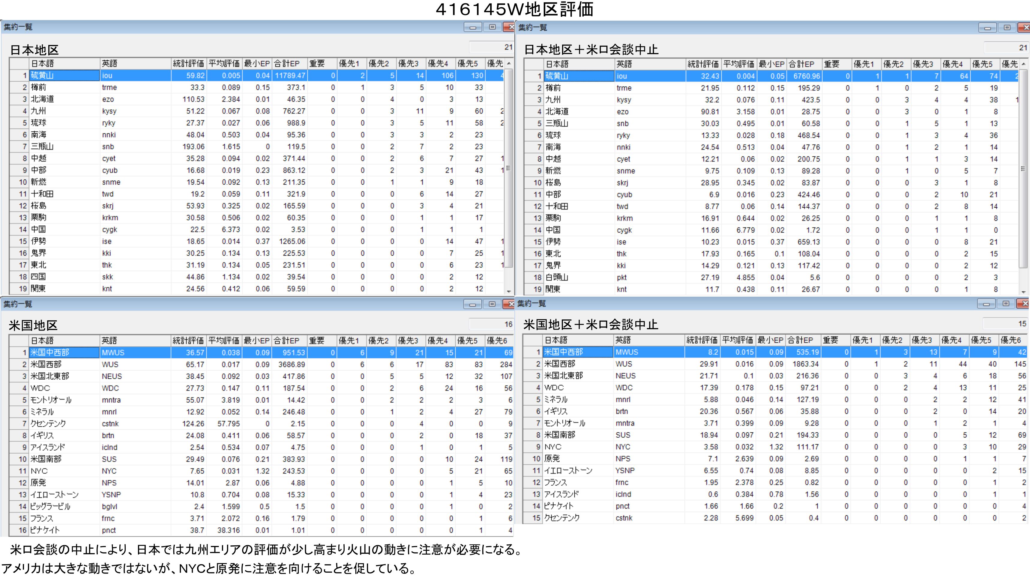 自然災害は金融問題と比較すると、大きな強調にはされていません。日本では九州の動きが強まると予想出来る所ですが、もともと日本では柏崎刈羽原発と若狭湾、九州周辺のリスクを明確にしてきており、今回の分岐で特別に変化をつける理由には乏しい状況でした。それを表している様に感じます。