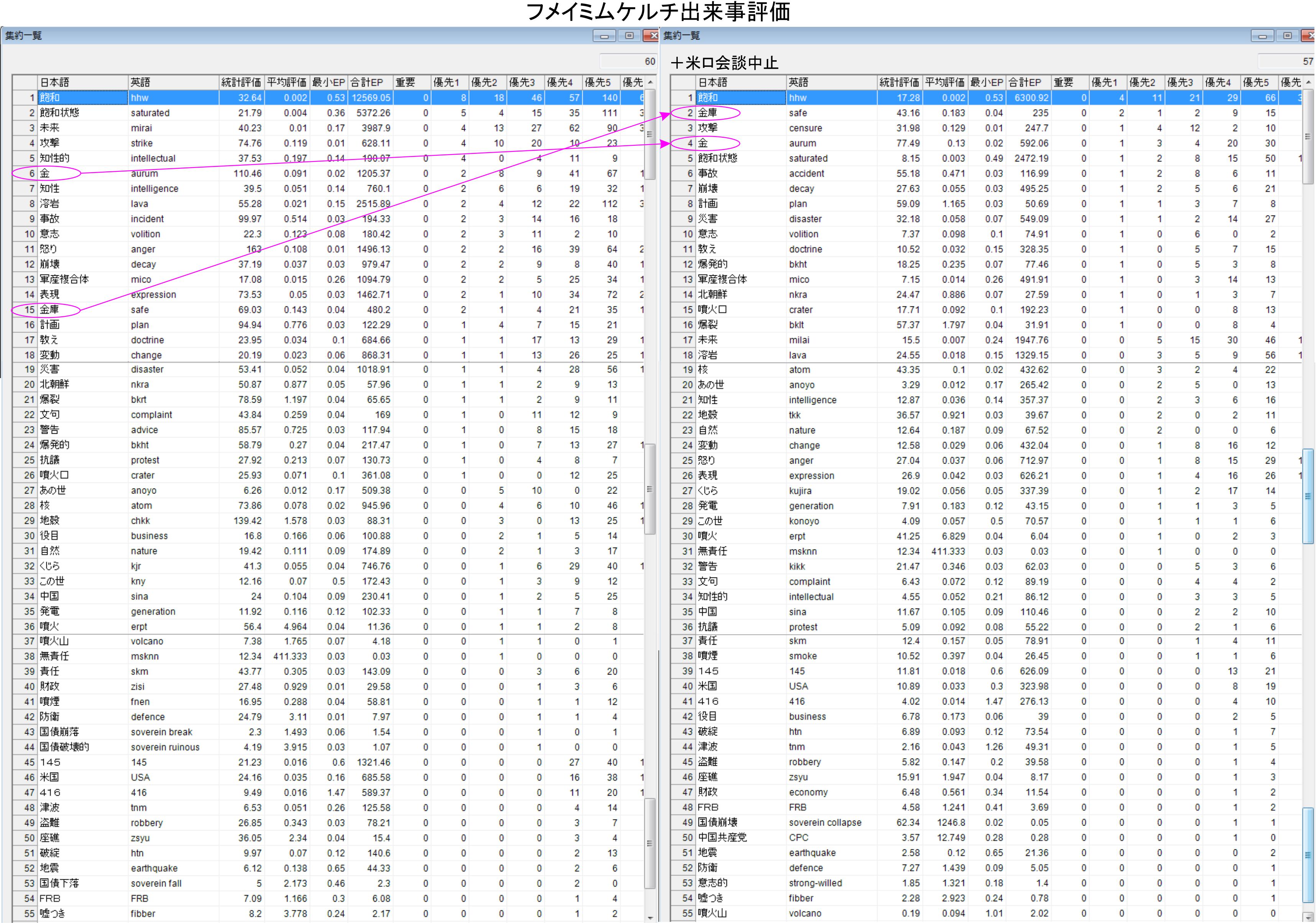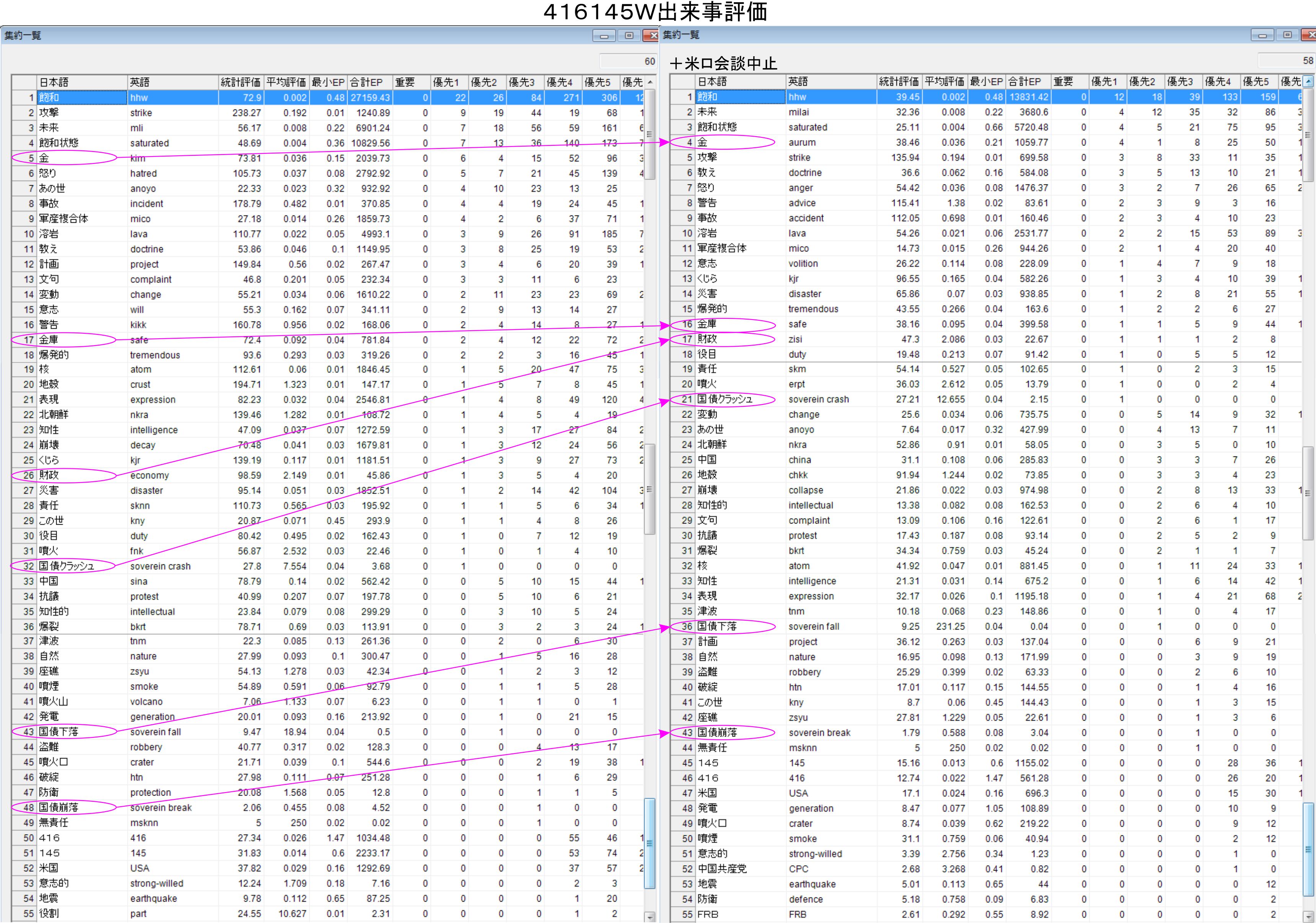 一カ所からだと調べた内容が統計的でも偶然に見えるという批判もあるので、HMIMMKRCHと416145Wの二カ所での確認作業としました。前者は53個のメインキーワード、後者は期待値が270くらいで100個を選んでいます。
