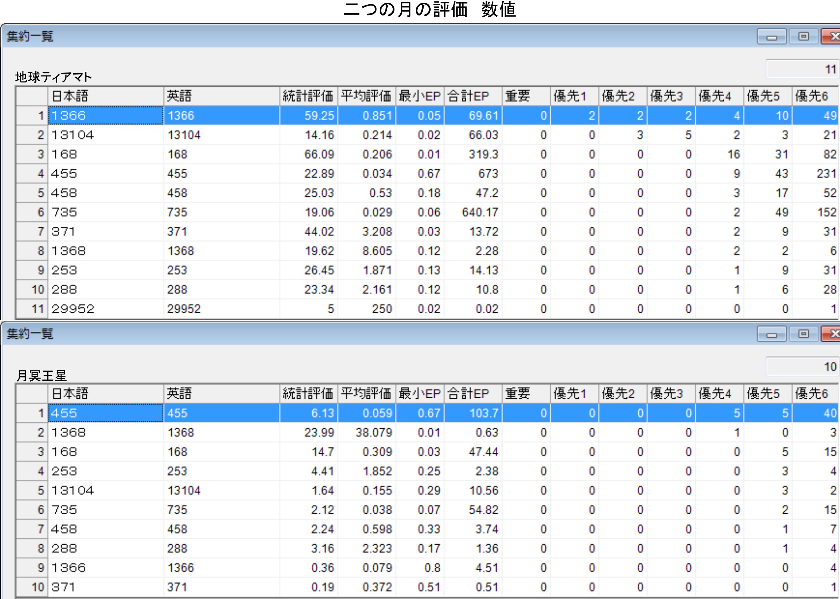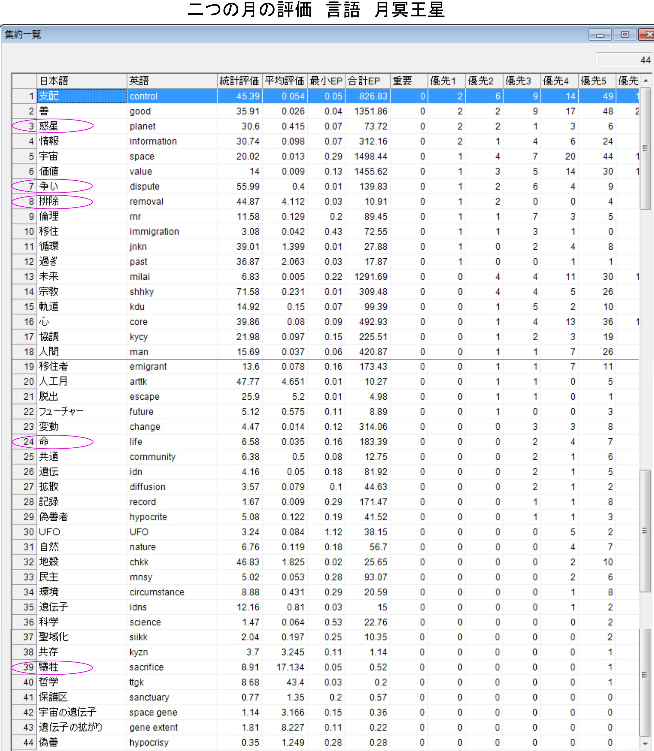月と冥王星の評価で見ると、こちらの強調項目には差があります。こちらとして争い、排除、惑星、命、犠牲を選んでいます。これは偽善との争いで、太陽系のこの世界から人間側の偽善の存在達を排除する争いであることと、惑星や様々な命さえも犠牲にする覚悟であった部分を確認した物です。