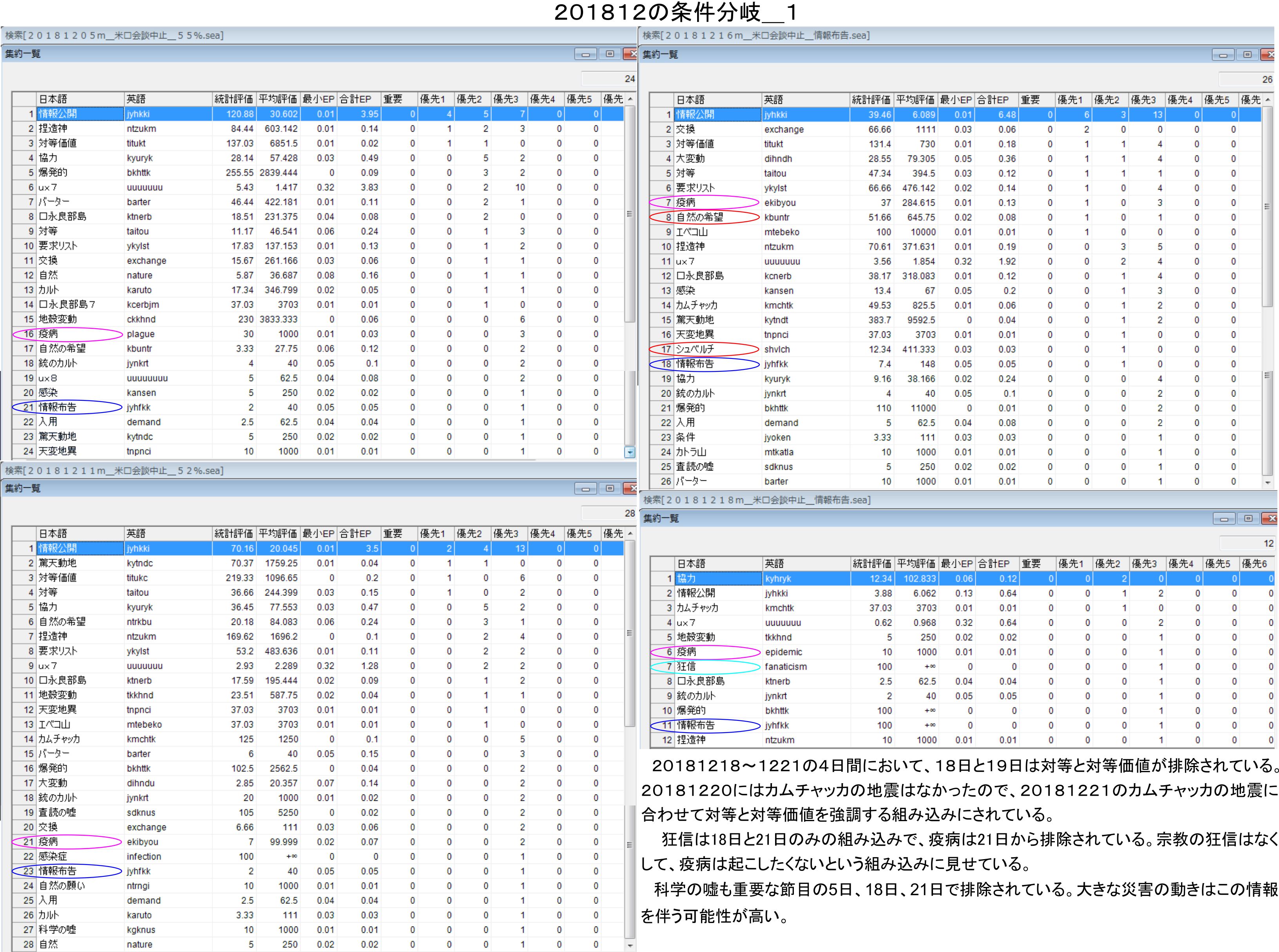 今回の地震には工夫があり、これまでは日時でヘブライ語の解析をしてきましたが、日時を外して距離と角度のみでの組み込みです。こうなると201812xxの8桁よりも桁数が3~4桁短いので、ヘブライ語の数値をそのまま使うことは止めにして、言葉全体でヘブライ数値を加算して3桁以下にしました。それ以上になる物は無視です。
