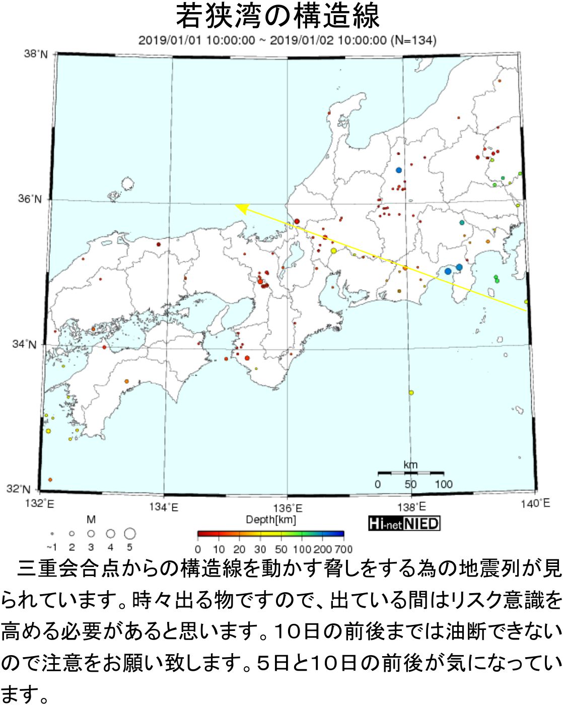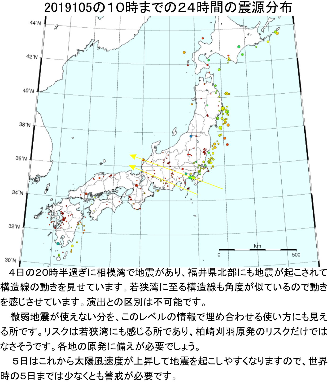 若狭湾側に注意を向ける地震列ですが、発生のない柏崎側でも安心の出来る状況ではないところです。備えと注意は重要でしょう。