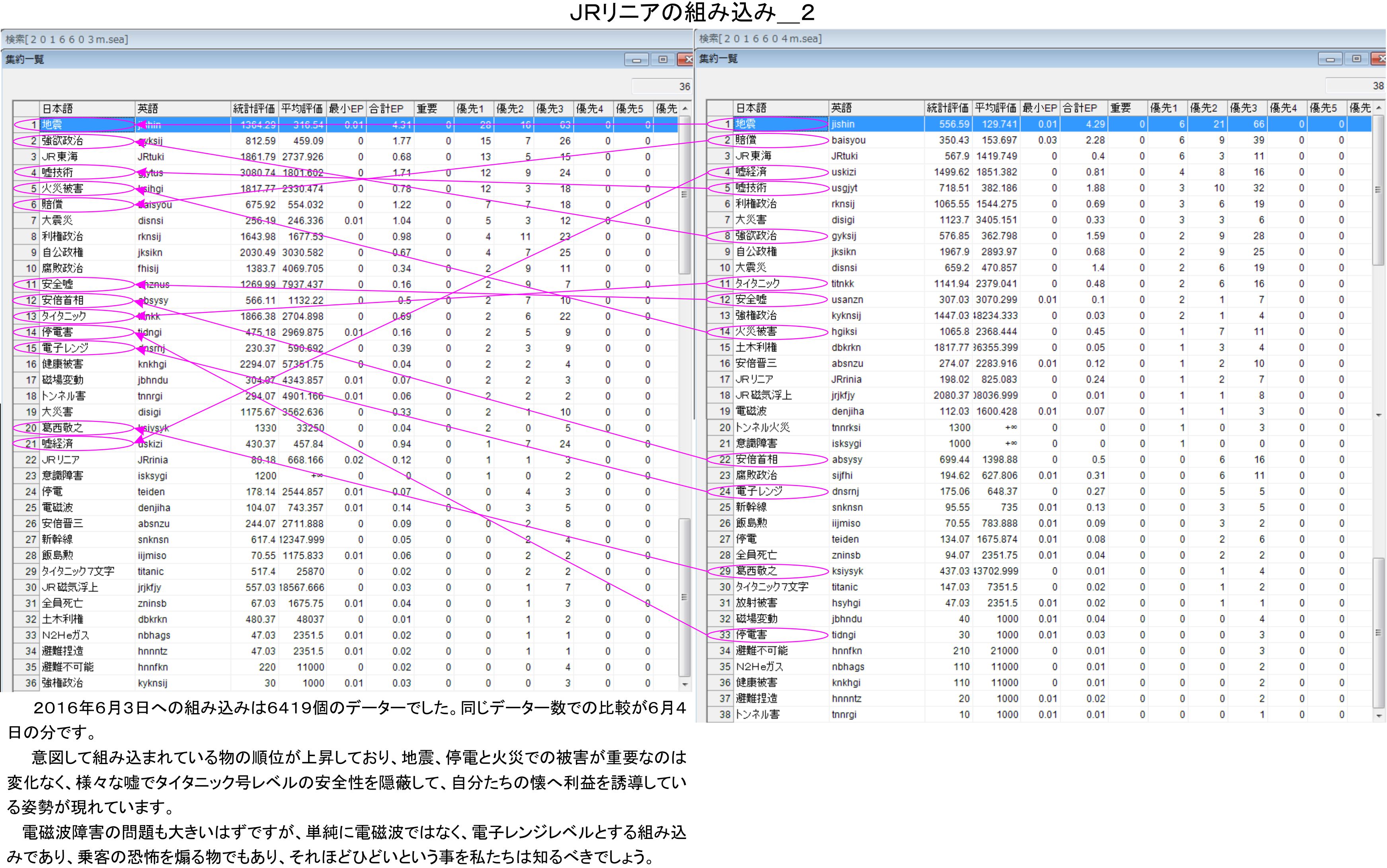 比較ではマゼンダの丸で同じ言葉の順位を比較しています。意図して組み込まれている物の順位が6月3日側では上昇しています。