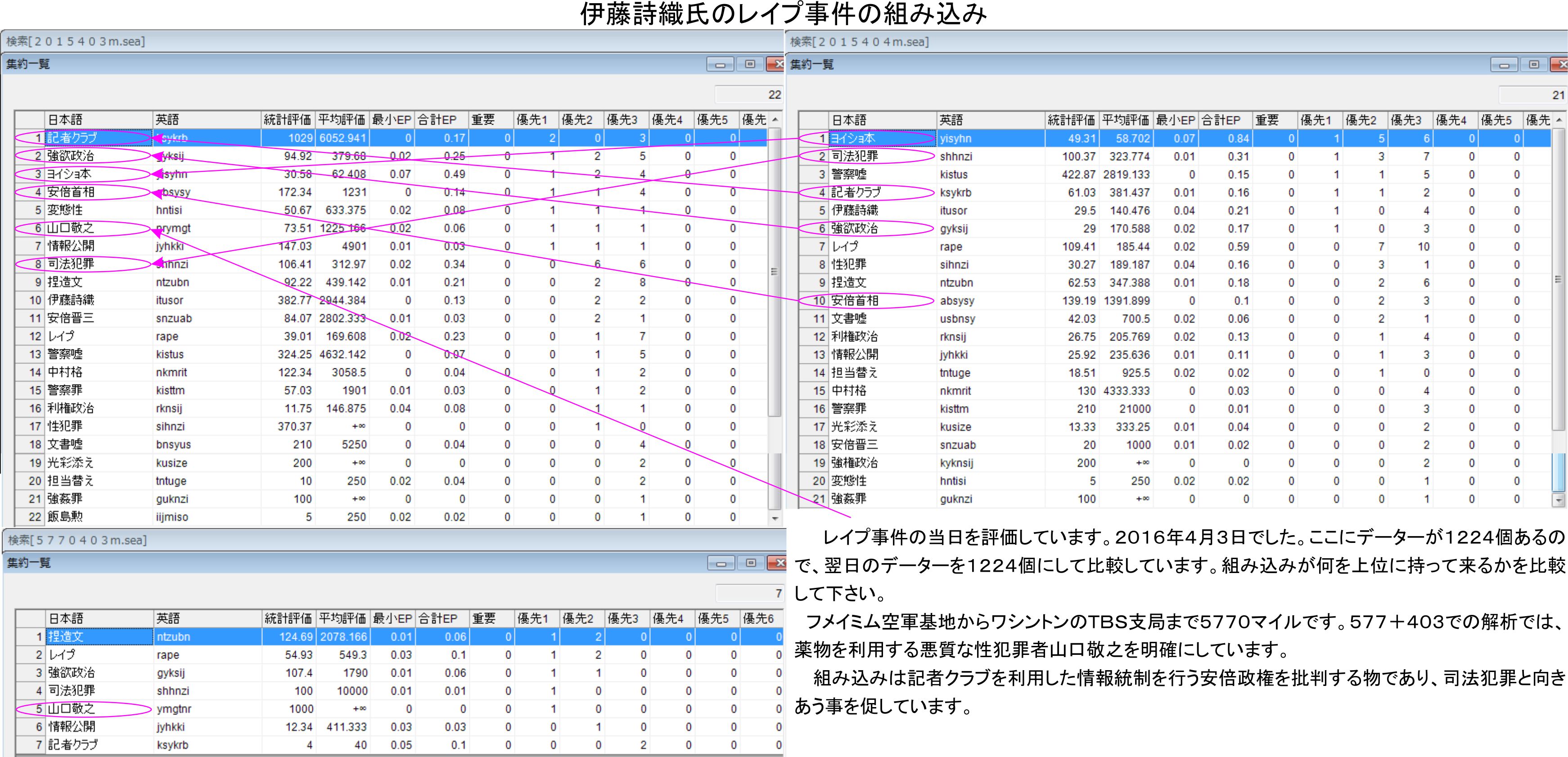 メインキーワードはレイプ事件の当日を評価しています。2016年4月3日でした。ここにデーターが1224個あるので、翌日のデーターを1224個にして比較しています。組み込みが何を上位に持って来るかを比較して見てみて下さい。