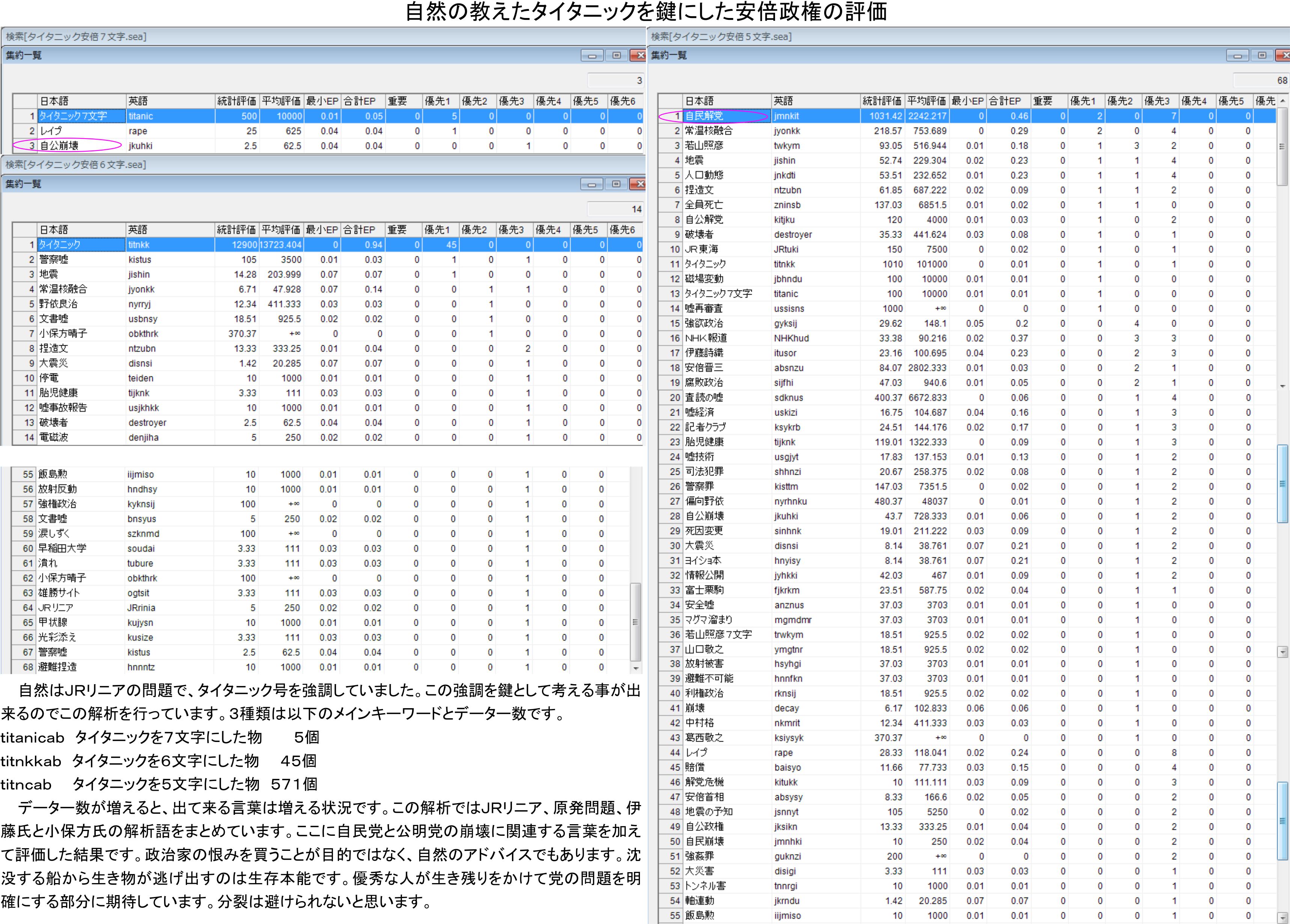 重要な言葉が選び出された結果が、タイタニック安倍7文字評価における自公崩壊であり、タイタニック安倍5文字評価における自民解党がトップの評価になる物です。