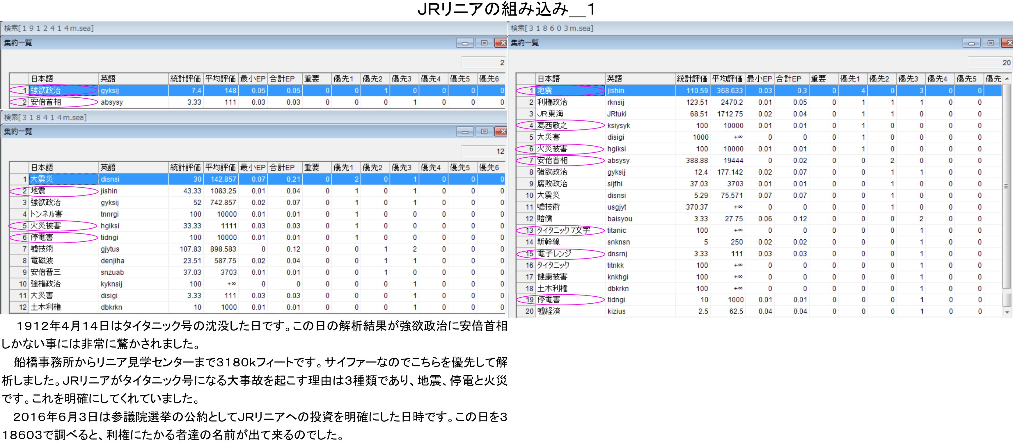 1912414が教えるデーターは、強権政治と安倍首相です。こちらがタイタニック号の沈没の関係を調べればその言葉を出せるはずですが、今回はJRリニアの安全性を批判し政治の腐敗を告発する内容です。このタイタニック号とは関係の薄いこの内容に対して強権政治と安倍首相なので、正直笑ってしまいました。組み込む側もここまでを意識していたことになるのです。
