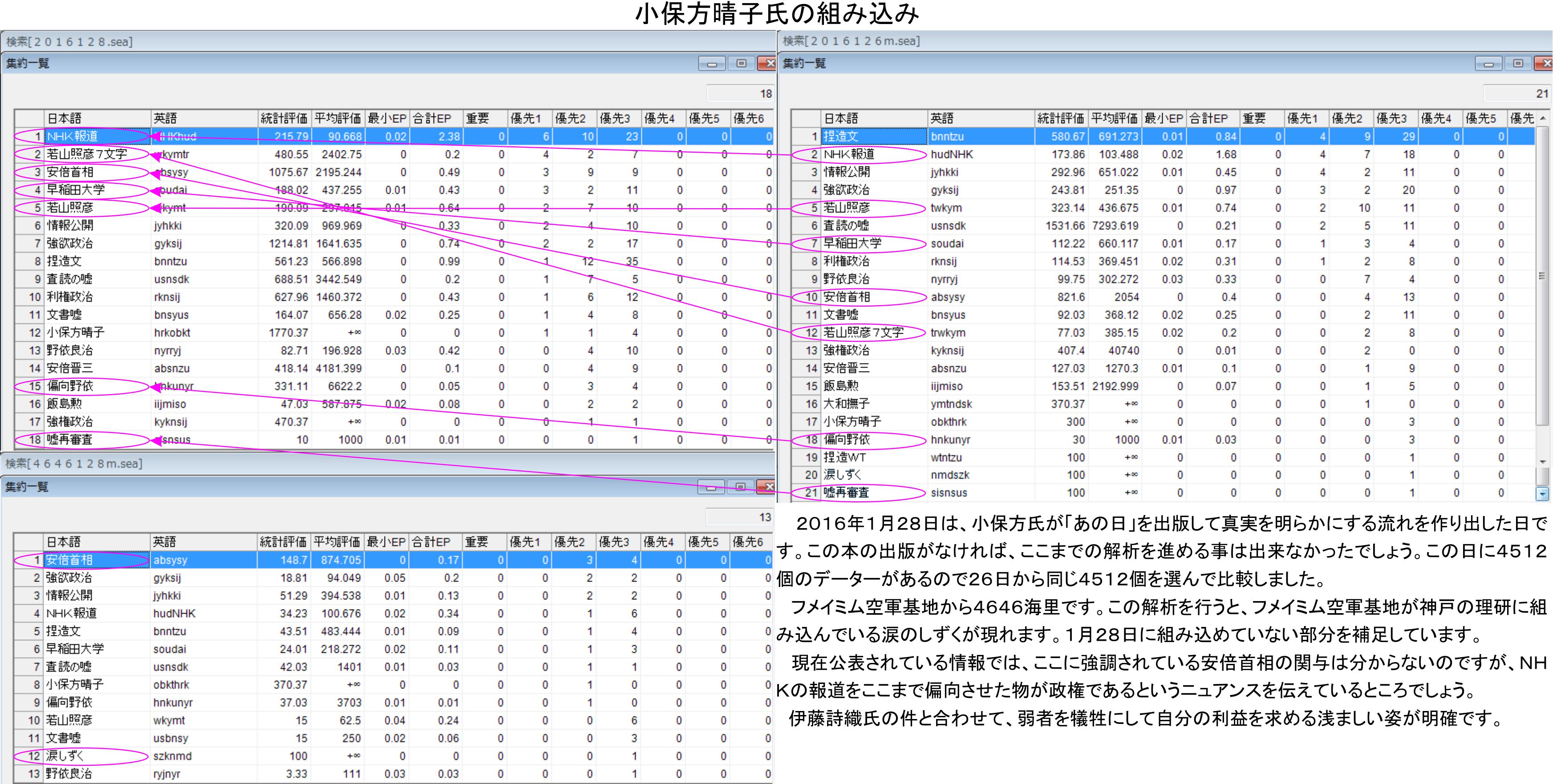 今回の評価に利用した2016年1月28日は、小保方氏が「あの日」を出版して真実を明らかにする流れを作り出した日です。この本の出版がなければ、ここまでの解析を進める事は出来なかったでしょう。この日に4512個のデーターがあるので26日から同じ4512個を選んで比較しました。