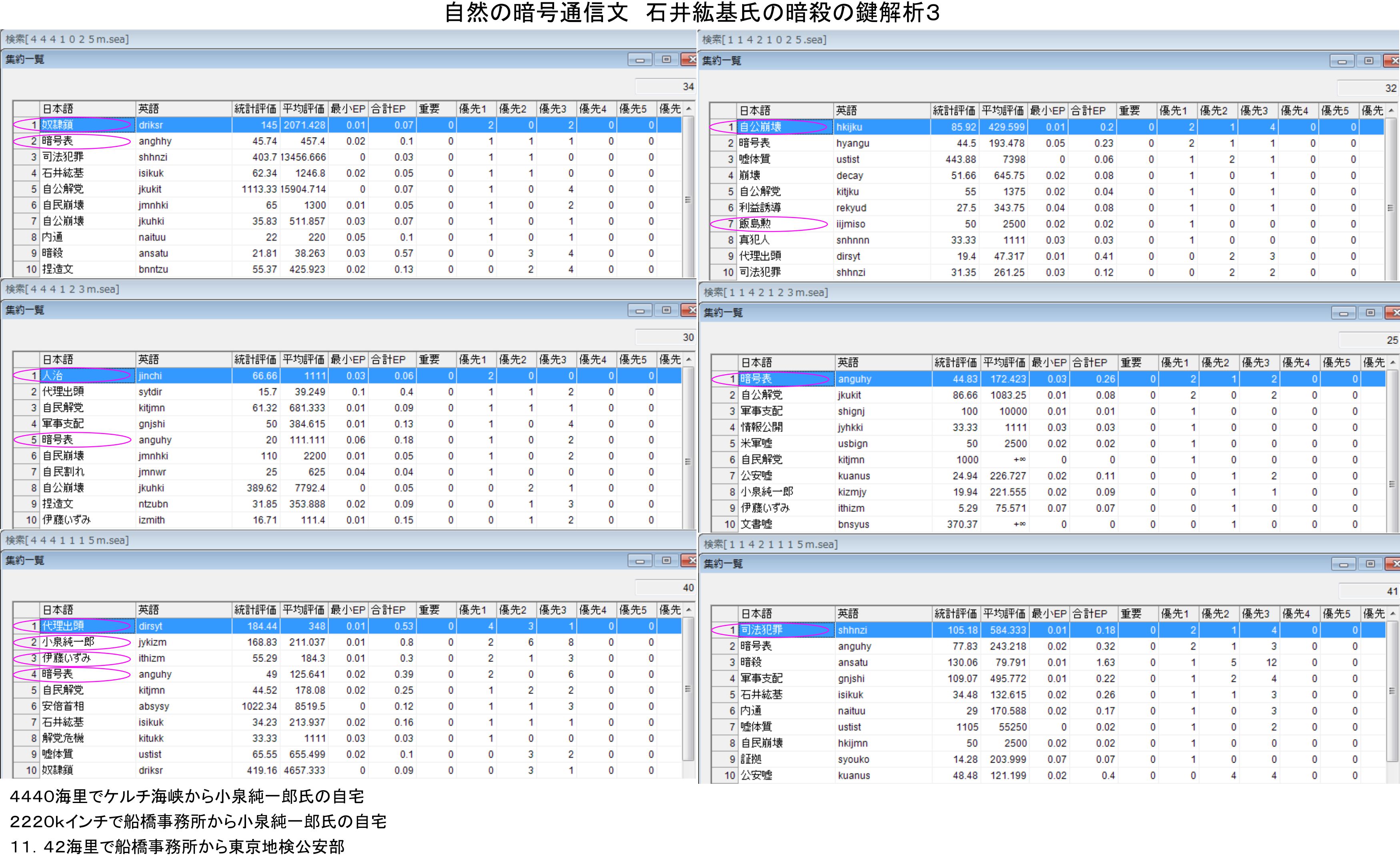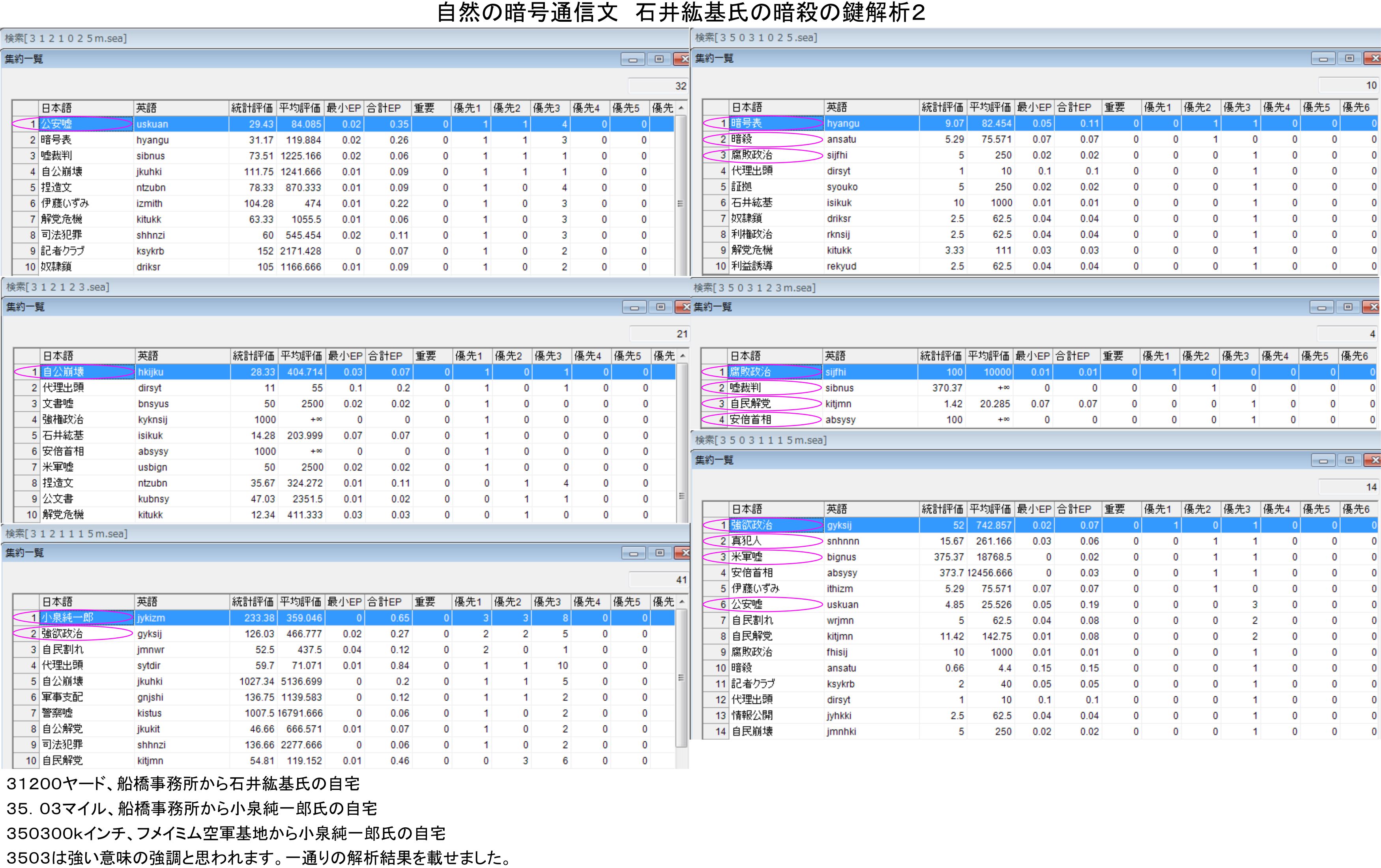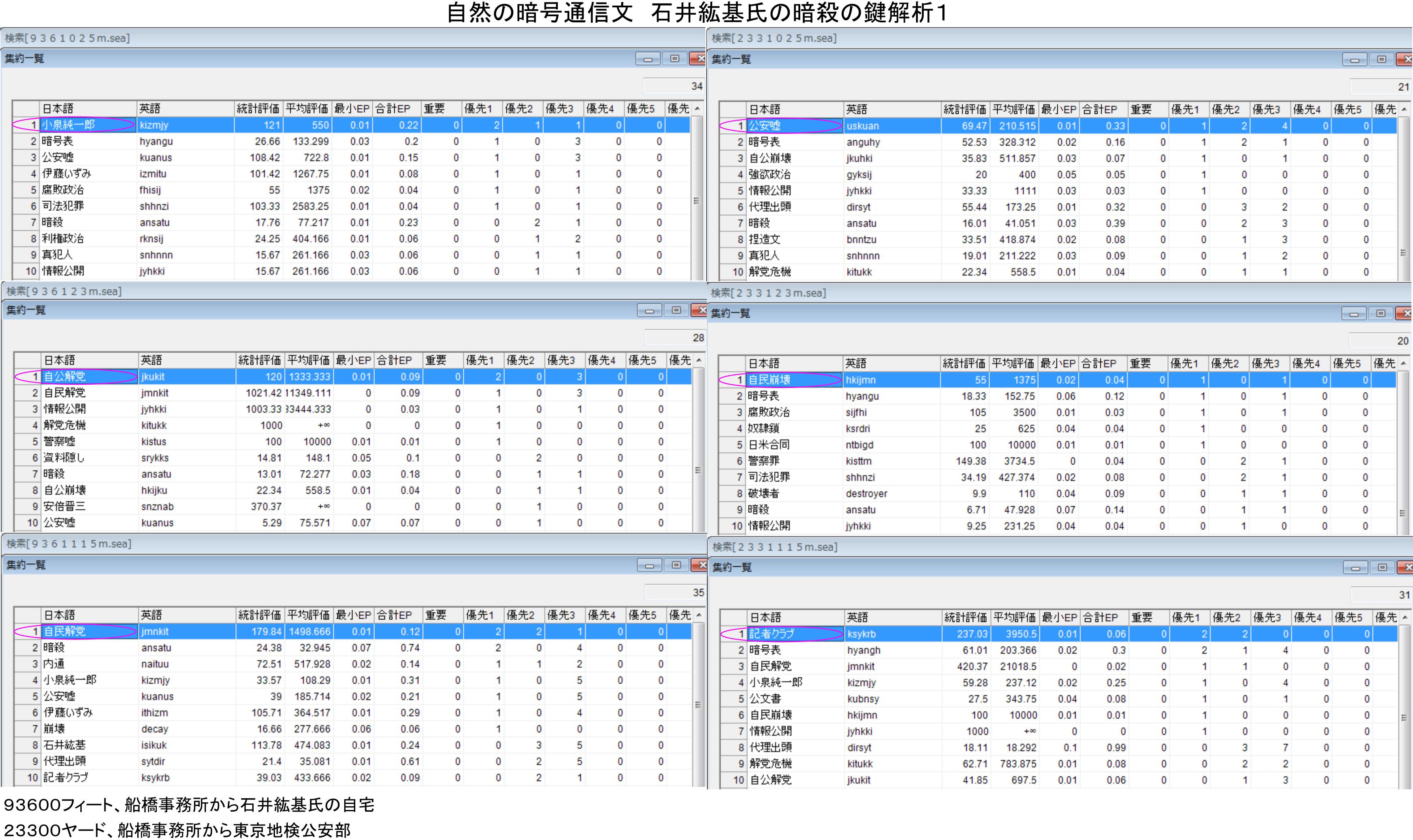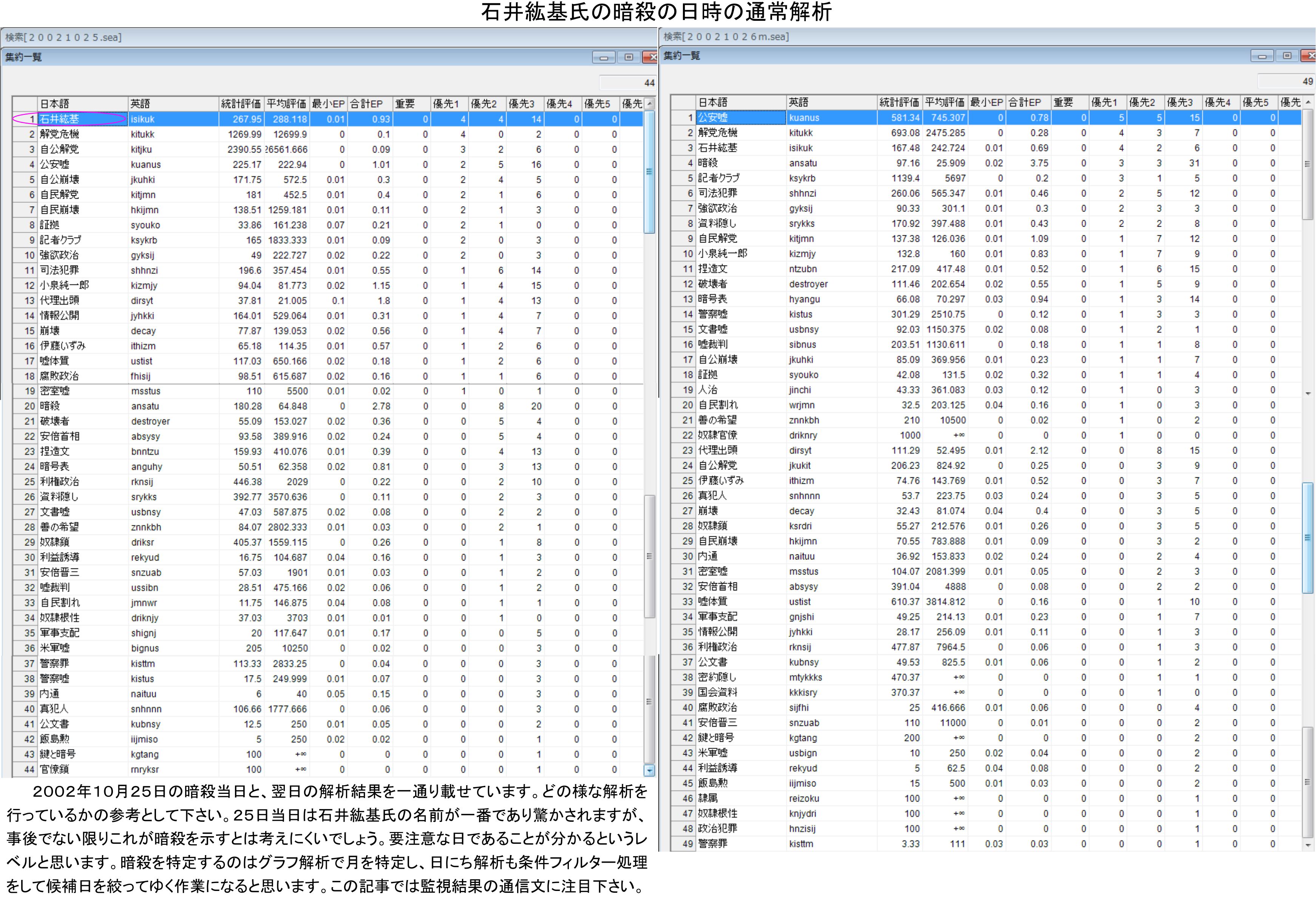 日時は2002年10月25日の暗殺当日と、翌日の解析結果を一通り載せています。どの様な解析を行っているかの参考として下さい。25日当日は石井紘基氏の名前が一番であり驚かされますが、事後でない限りこれが暗殺を示すとは考えにくいでしょう。要注意な日であることが分かるというレベルと思います。暗殺を特定するのはグラフ解析で月を特定し、日にち解析も条件フィルター処理をして候補日を絞ってゆく作業になると思います。