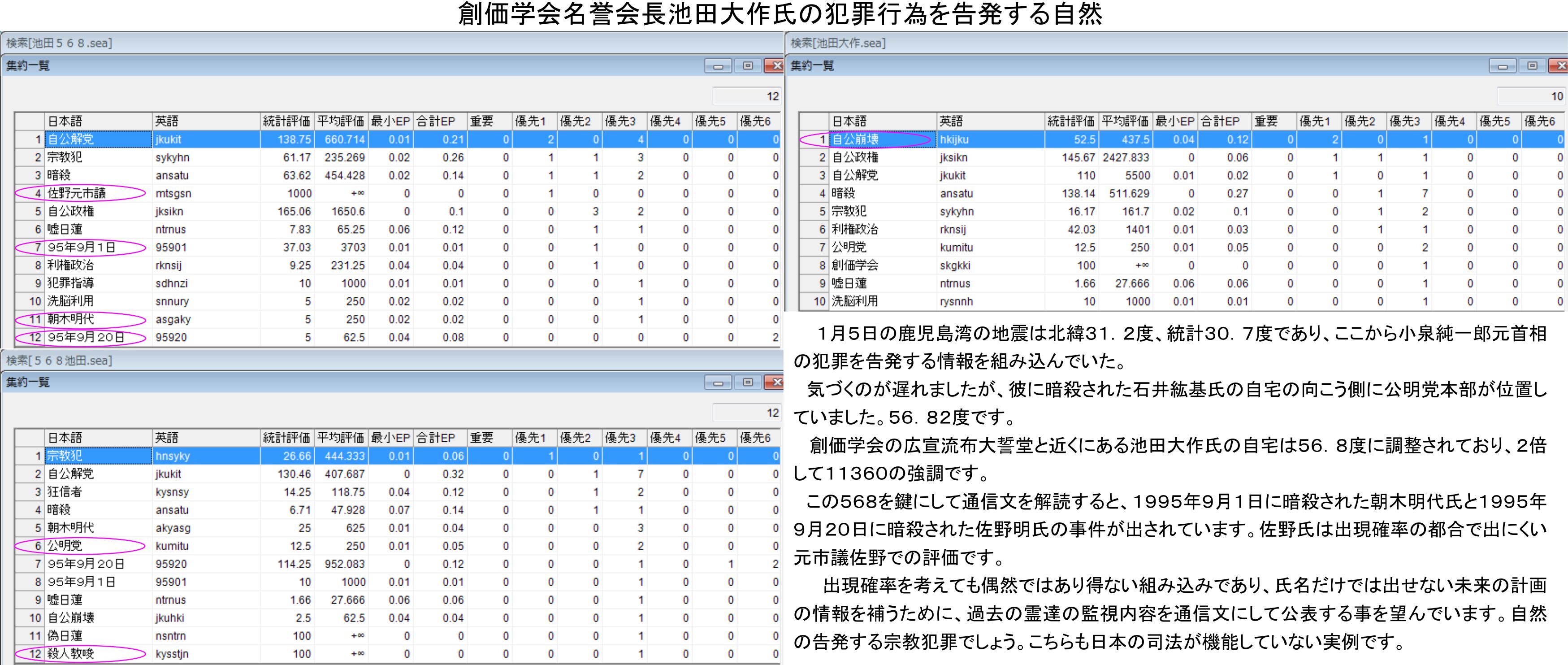 ここからは30368、79050、29952と三種類もの強調が出ており、創価学会名誉会長池田大作氏の犯罪行為を告発したい自然と人霊達の意図は明確でしょう。地震を操る彼らは神を名乗る存在であり、池田大作氏は日蓮の生まれ変わりを自称する偽物であると通信文に組み込んでいる程です。