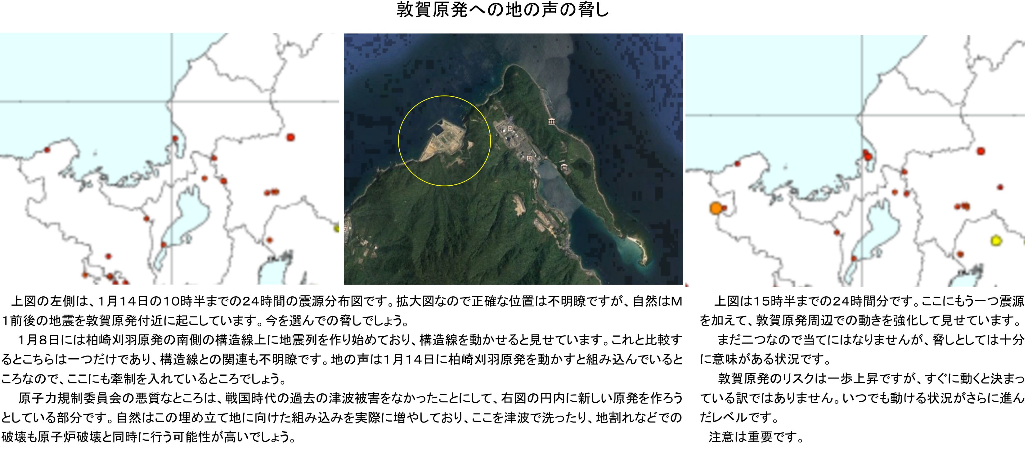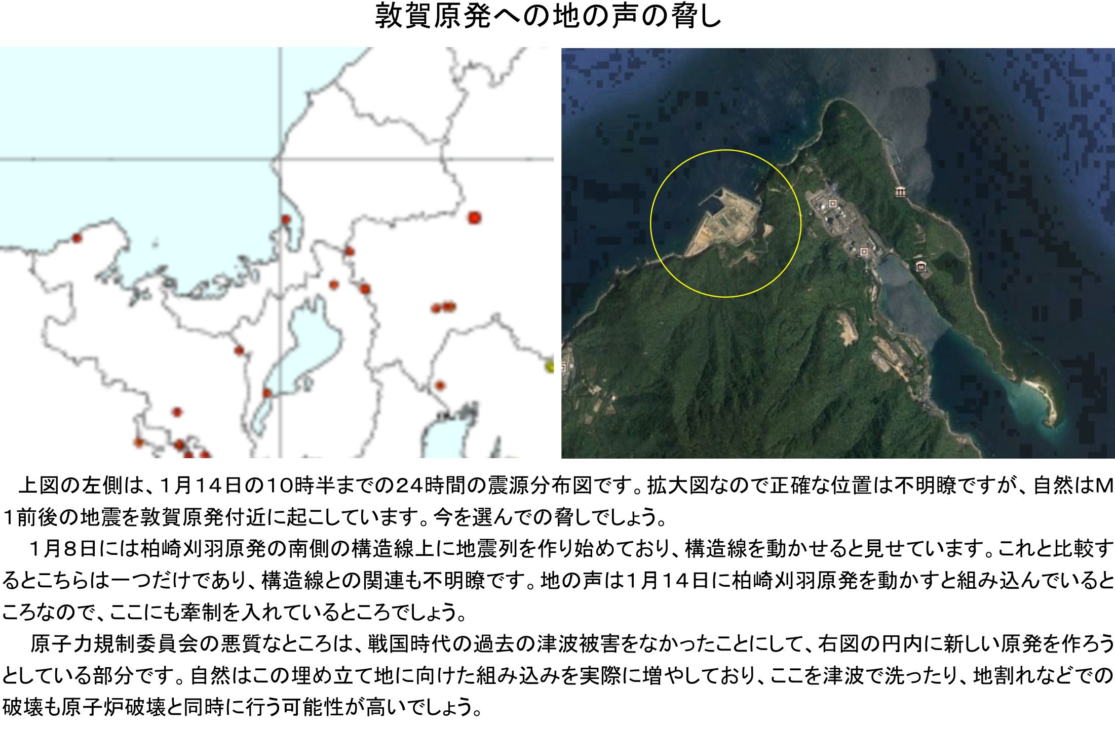 イラストの上図の左側は、1月14日の10時半までの24時間の震源分布図です。拡大図なので正確な位置は不明瞭ですが、自然はM1前後の地震を敦賀原発付近に起こしています。今を選んでの脅しでしょう。