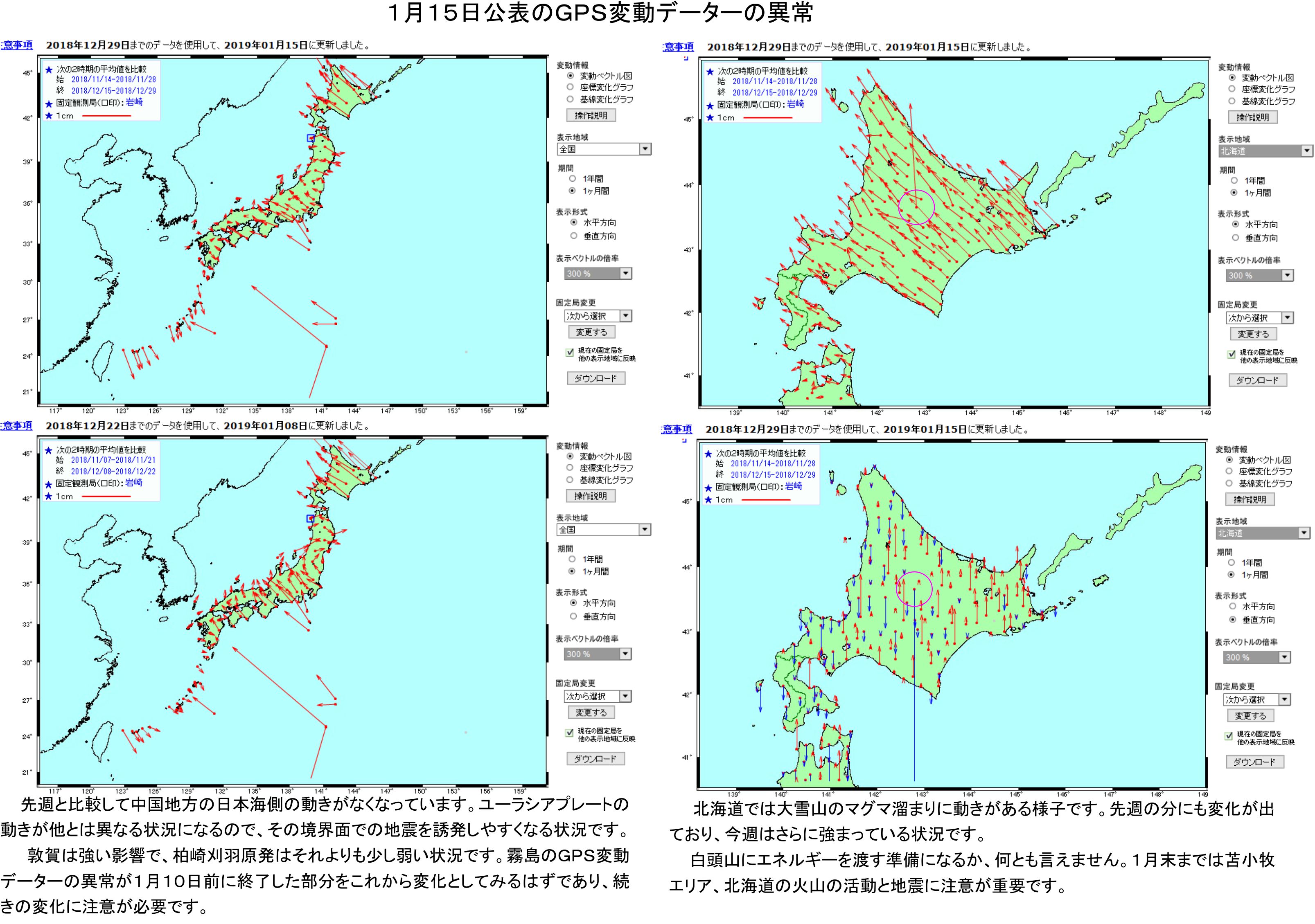 敦賀原発は強い影響で、柏崎刈羽原発はそれよりも少し弱い状況です。霧島のGPS変動データーの異常が1月10日前に終了した部分をこれから変化としてみるはずであり、続きの変化に注意が必要です。8日の鬼界カルデラの地震の影響が強ければ、大きな変化を見せてくるかも知れません。