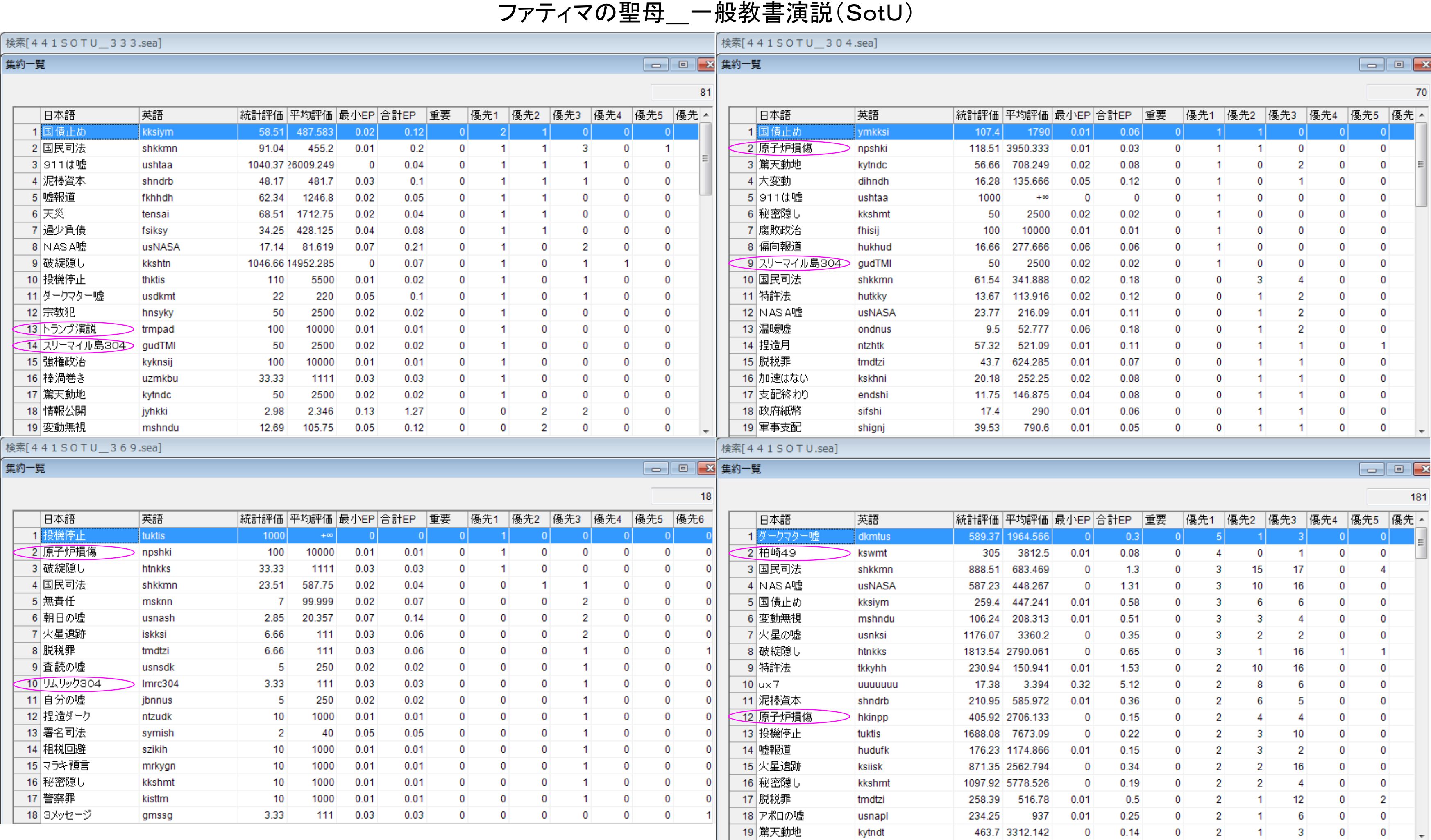 まずはこの部分を鍵の組み込みで確認しました。一般教書演説と自然災害に紐付けがあるかの確認です。イラスト3枚に結果を載せていますので参照下さい。