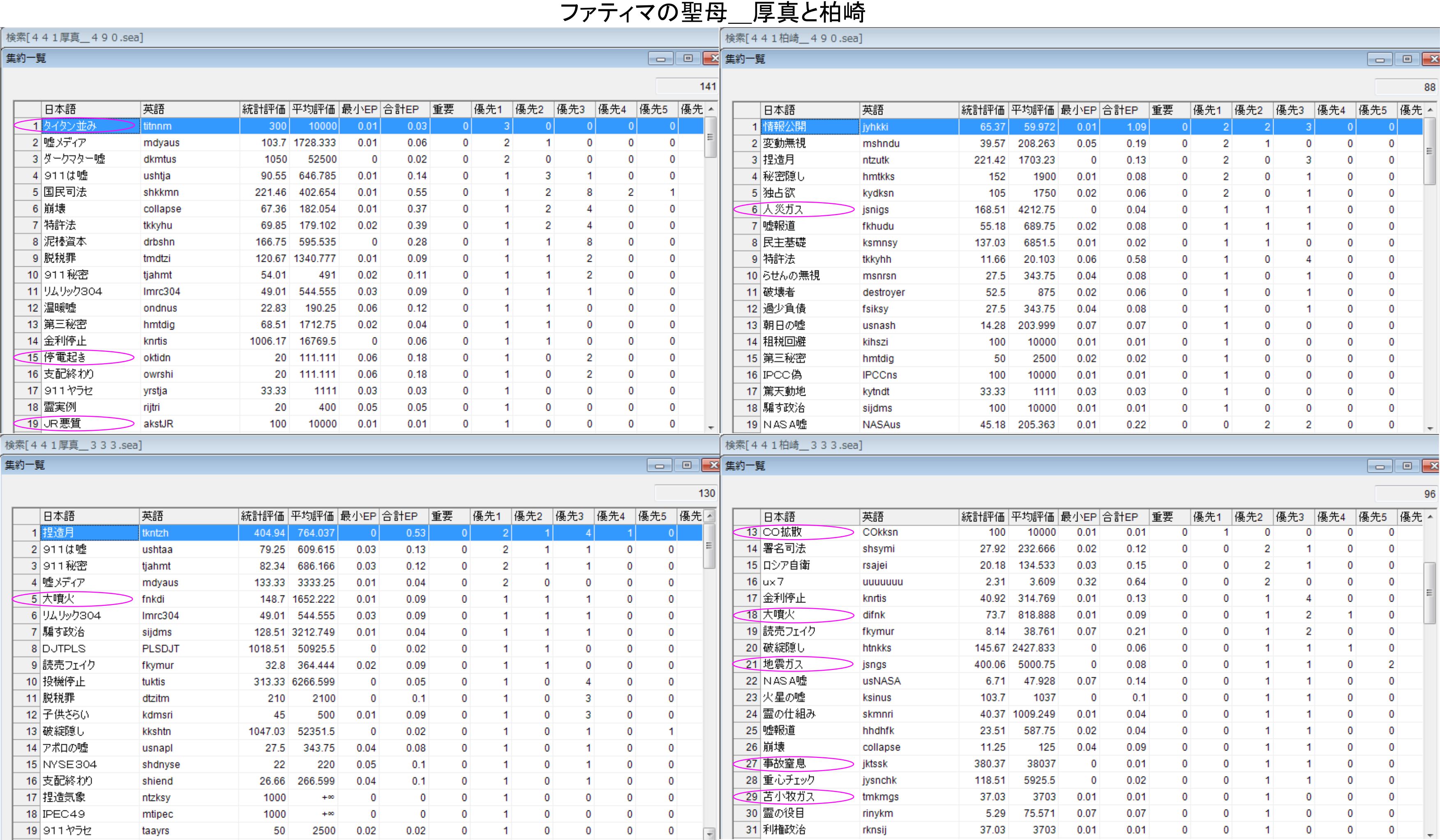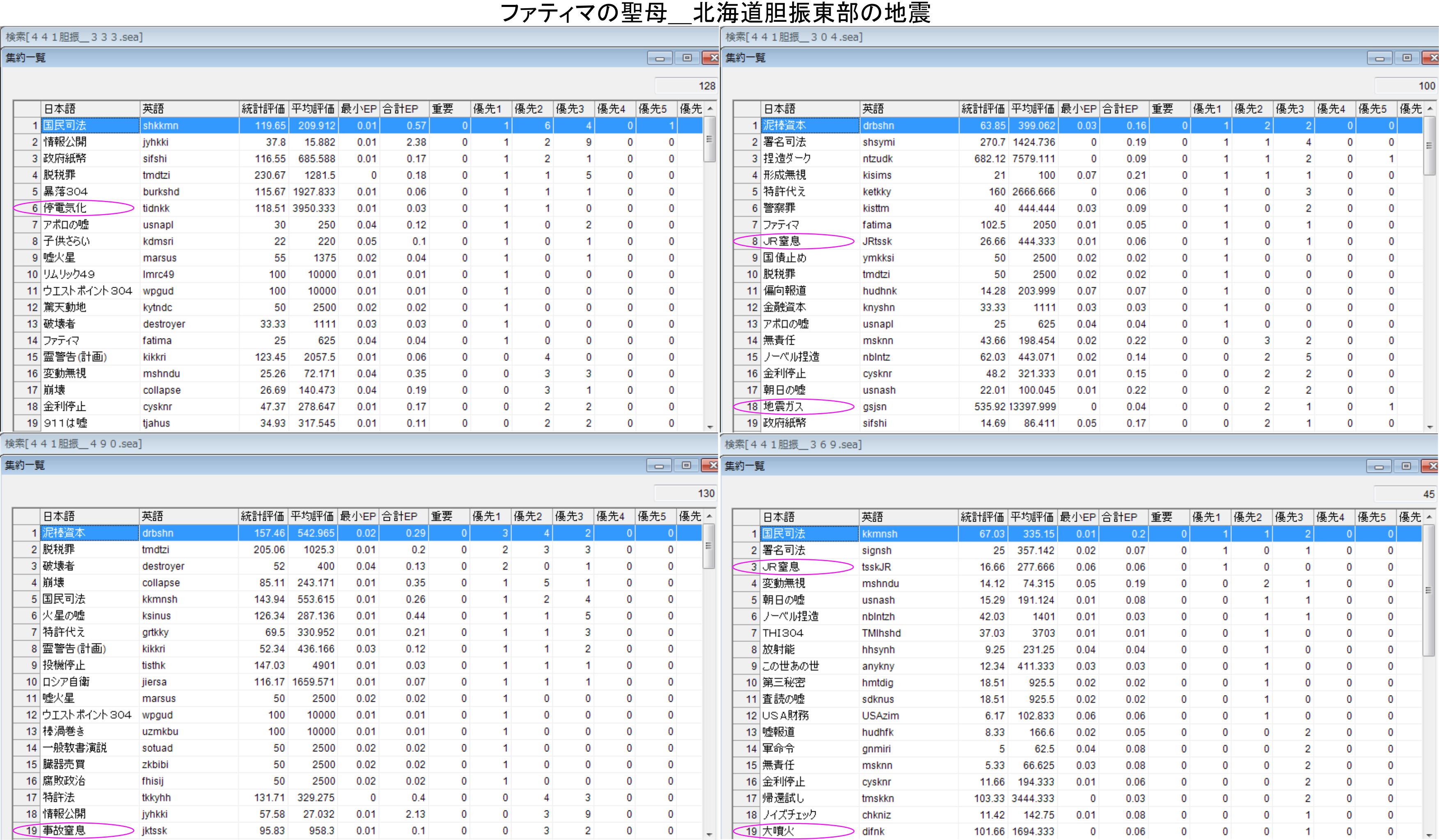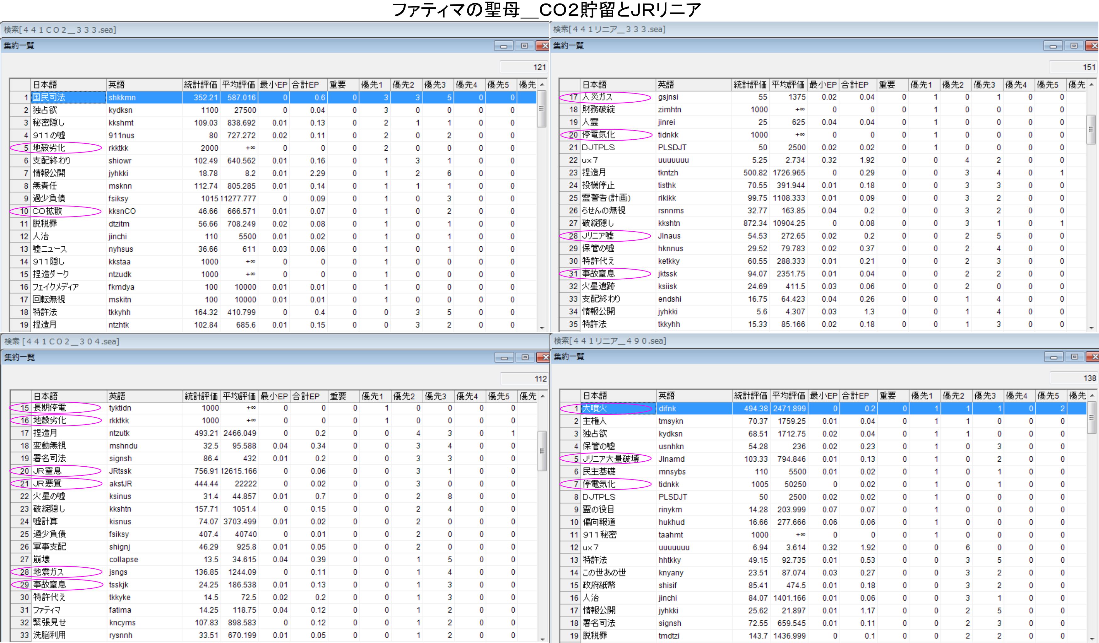 1月8日に地の声が重要な事が起きると伝えており、この日に鬼界カルデラのマグマ溜まりがM6.4の地震を起こしています。この地震は震源地があとから0.1度ずれるという状況であり、2カ所の震源地を情報として伝えました。この二カ所を利用して様々に状況を検討した結果、441でファティマの聖母を鍵とし、残りを304の悪魔を始めとして369のミロクなど、解析に使える様にしていました。メインの鍵が441のファティマの聖母、副キーが304や369などの様々な数値です。