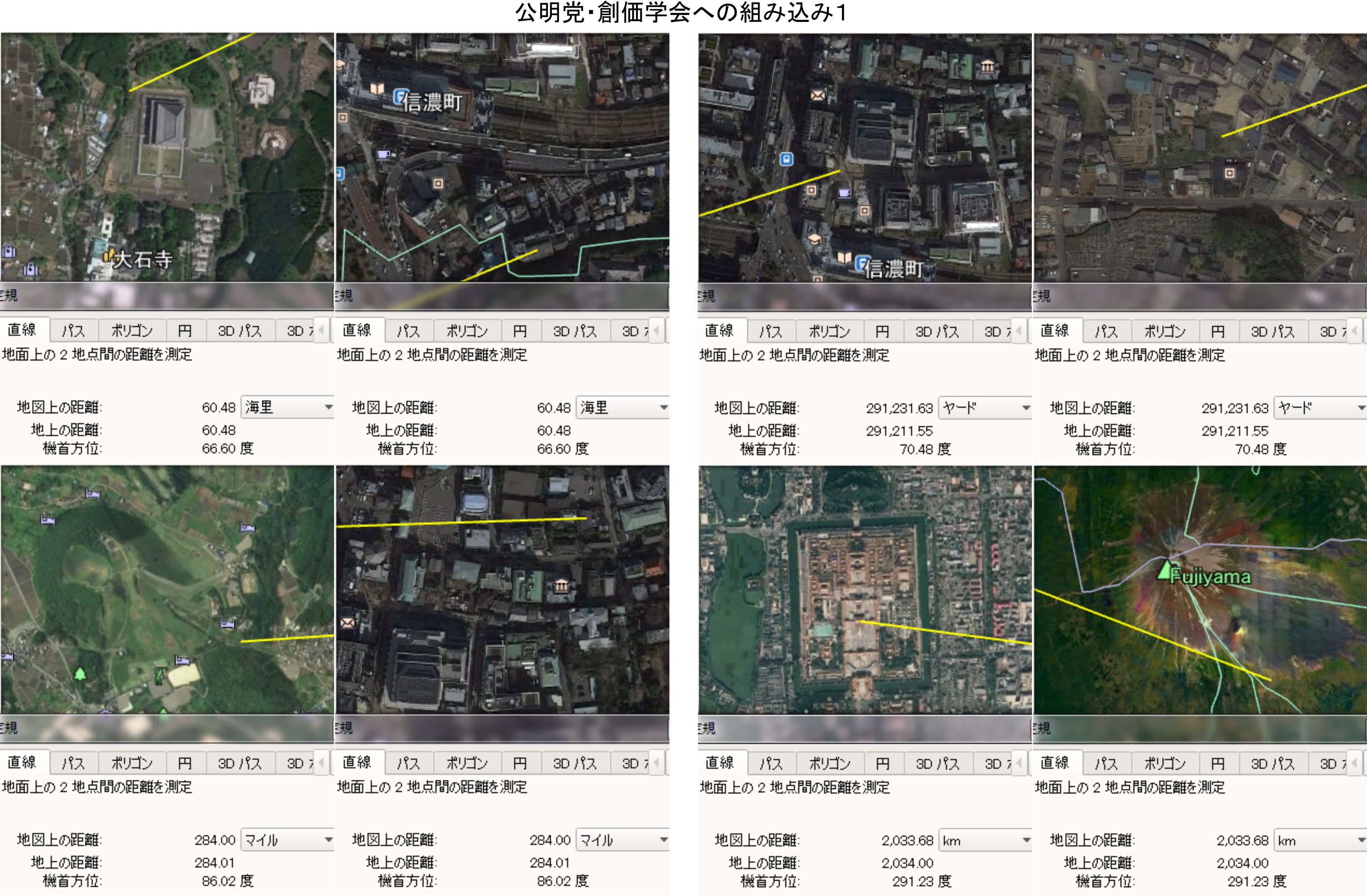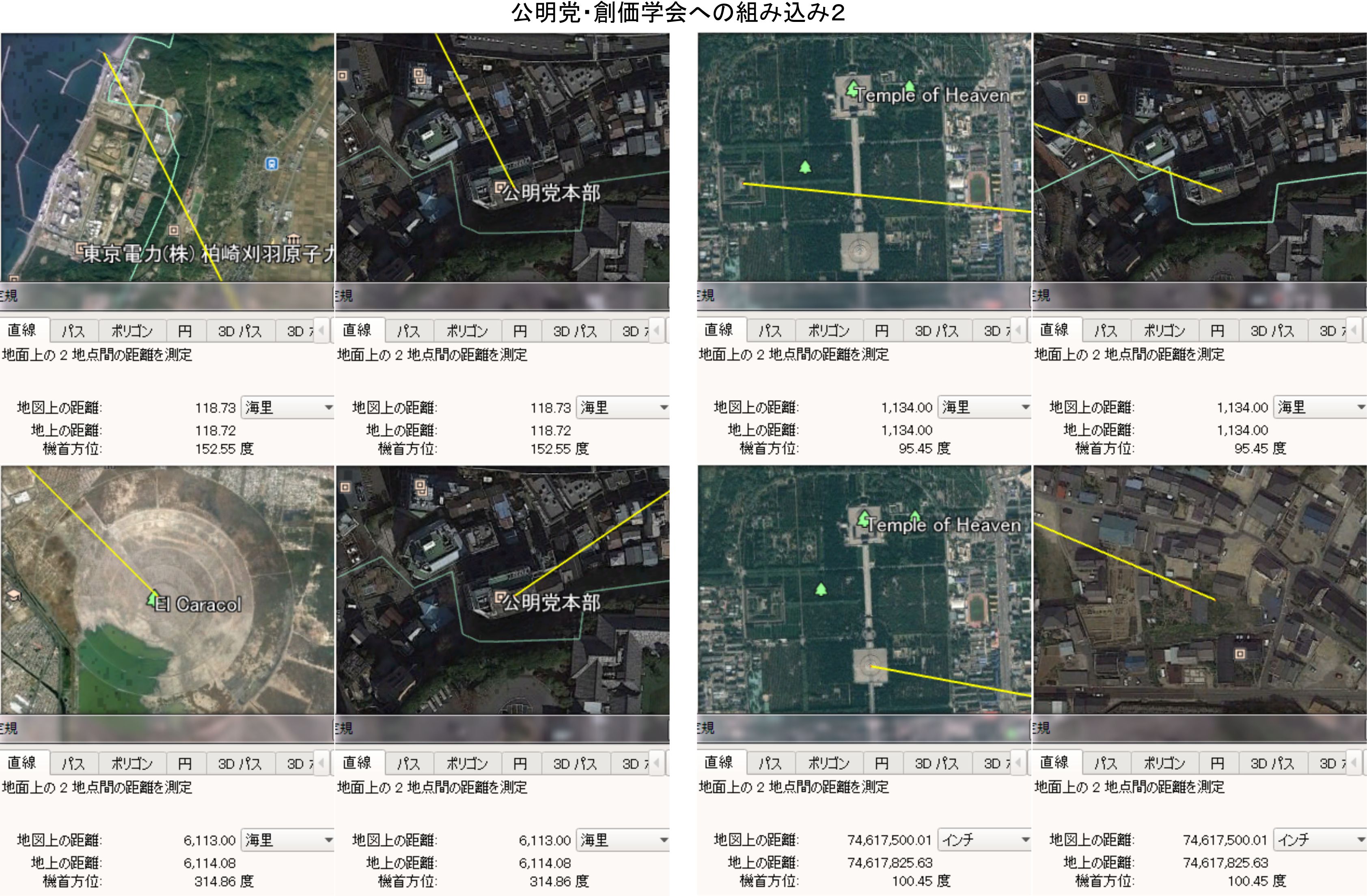 組み込みはイラストにもまとめましたのでご覧下さい。公明党本部と創価学会本部の広宣流布大誓堂と近くにある池田大作氏の自宅(以下三カ所)は他の遺跡や団体から、以下の様に指し示されています。数が多く、これらが偶然である事はあり得ないのです。あとでこちらの個人への組み込みとも比較します。
