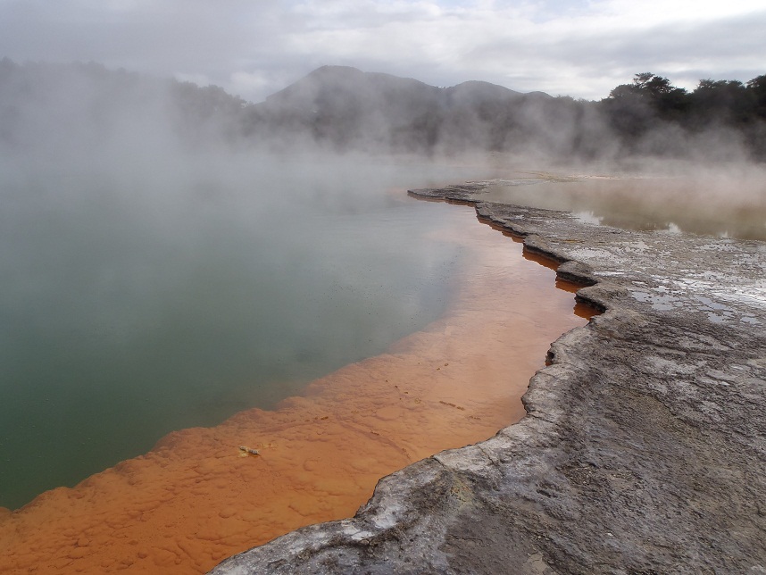 添付の写真はニュージーランドの観光地であるロトルア湖近くのシャンパン池の写真です。カラフルできれいな池ですが、阿蘇山の火口湖と同じく今も活動をしており、ここは火口が直接地下水の涌きだし口になっています。直径30m位の池ですが、深さは150m以上あります。火口が地下水で埋められているイメージです。