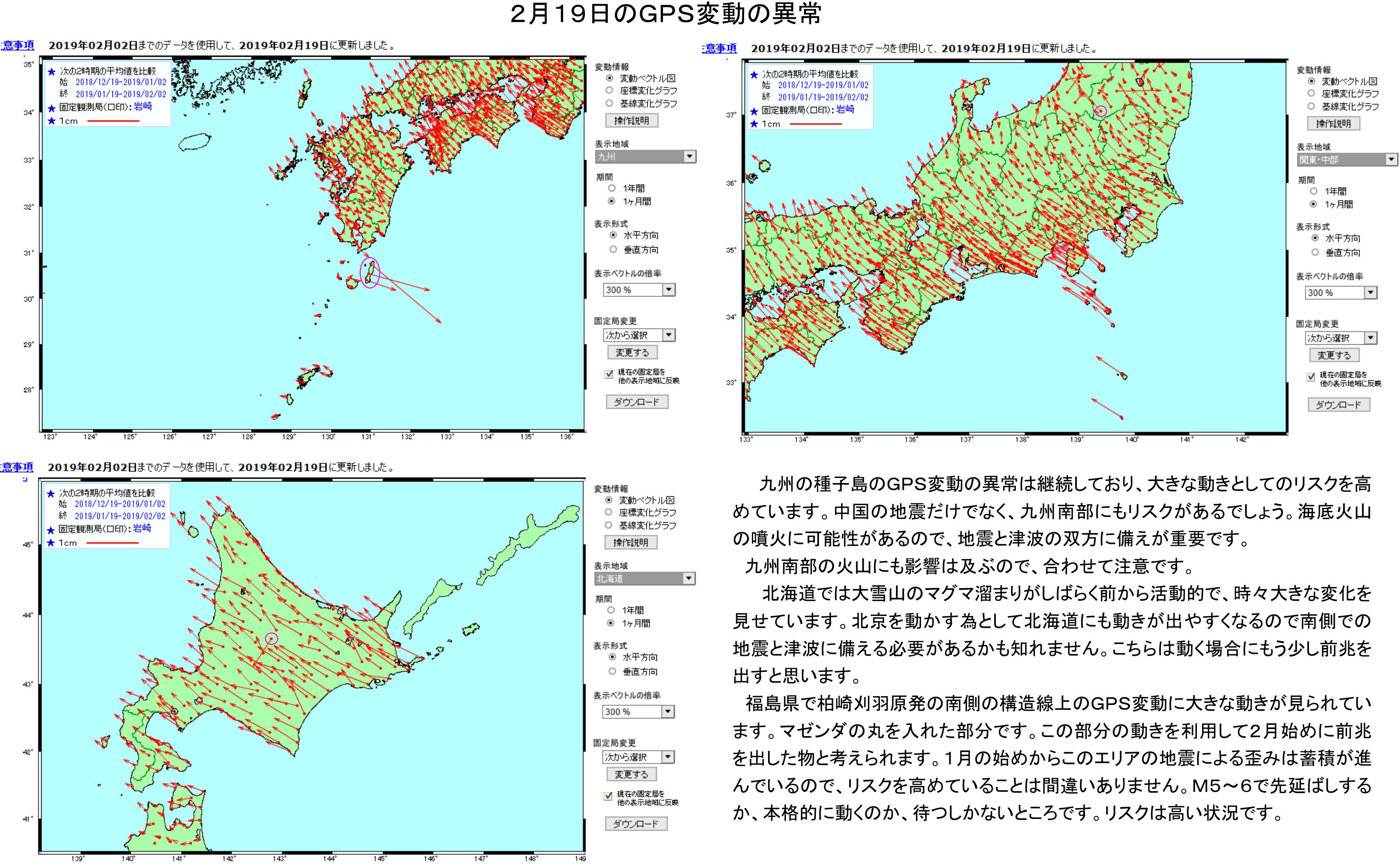 2019222を当日に起こして強調する理由は不明瞭です。続きに何かあると言うのかも知れませんが、この大きさの地震のあとに遠隔地での大きな動きは普通ないに等しいでしょう。