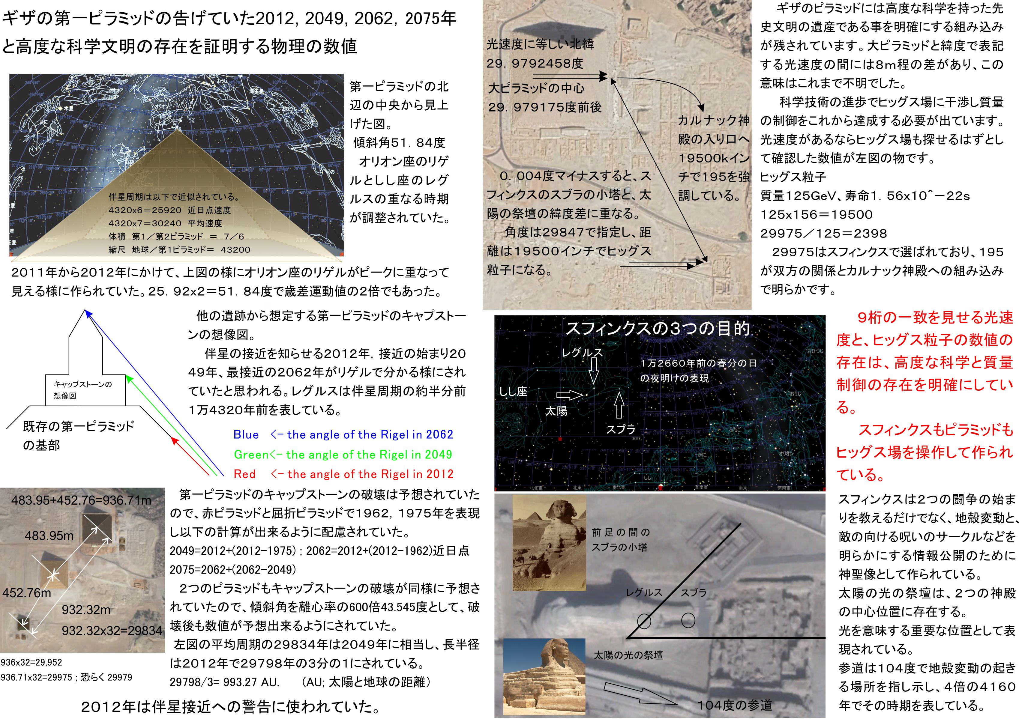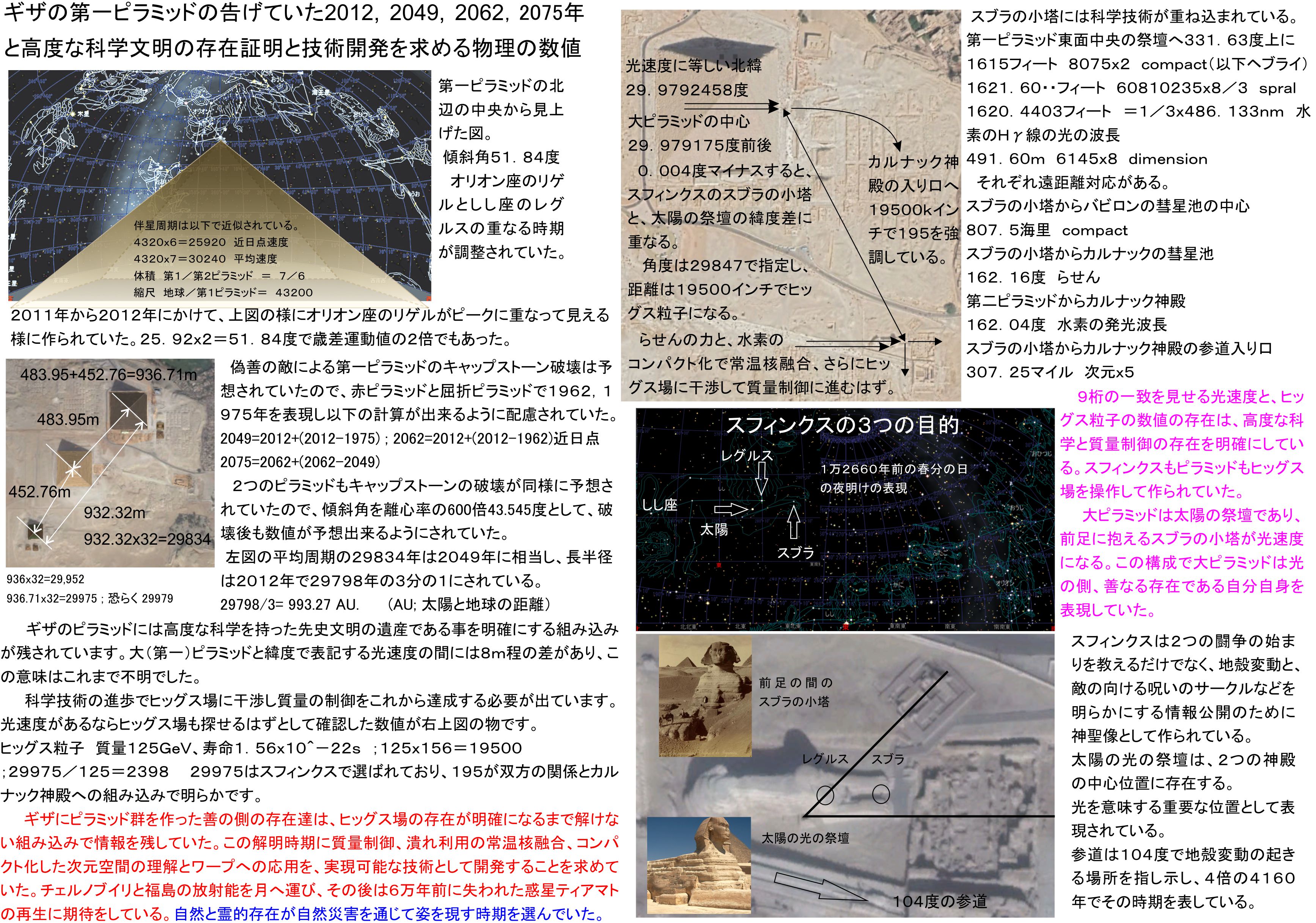 残す記事で、量子論の記事は非常に重要になっており、3回に分けるほどになると思われます。昨日の記事で説明したように光速度の9桁とヒッグス粒子の合計6桁をギザの大ピラミッドとスフィンクス、カルナック神殿に組み込んでいる部分が明確になるところです。エジプト学を始めとし、先史文明が存在すると困る人々には打撃になるでしょう。