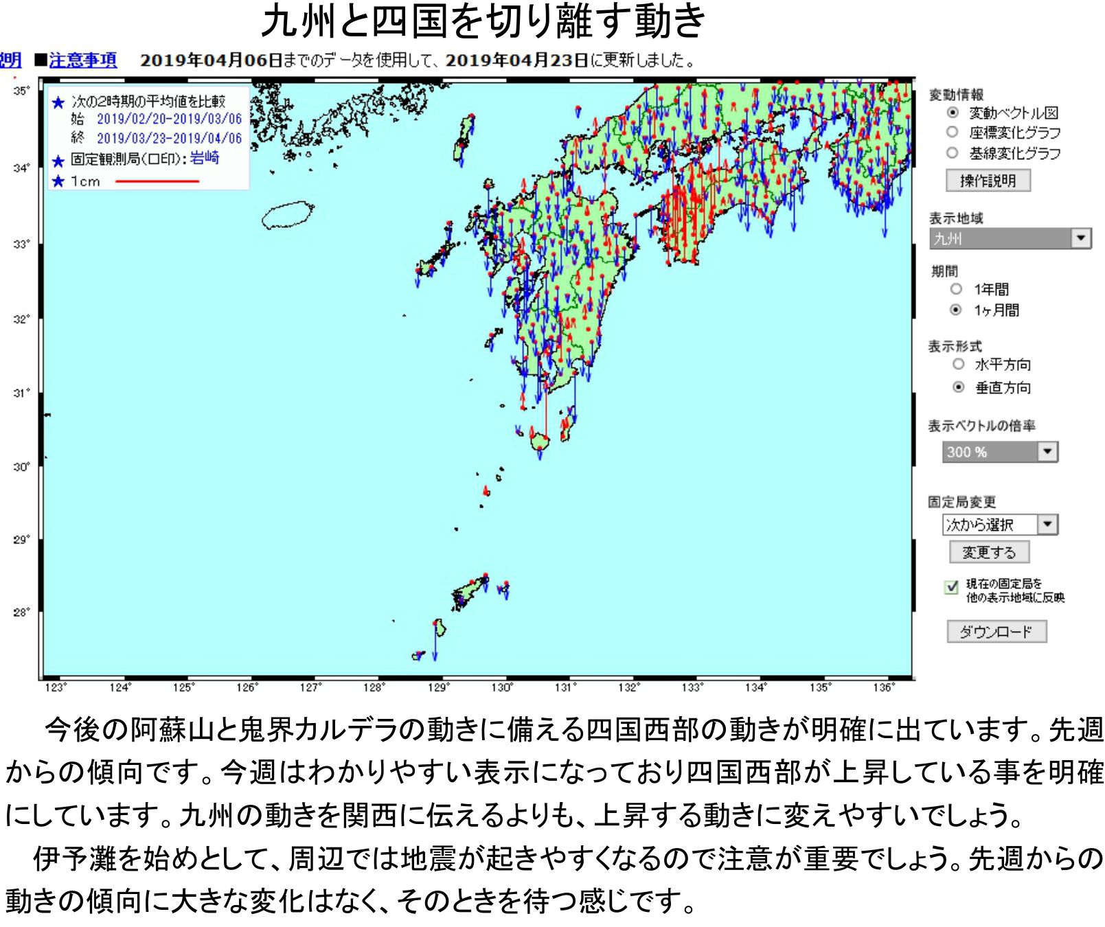 GPS変動が本日公表で、先週とあまり変わらない状況でした。四国西部の九州との切り離しが明確なのでイラストに載せておきます。大分が伊予灘に押し出す動きを先週同様に続けており、伊予灘のリスクは高いでしょう。
