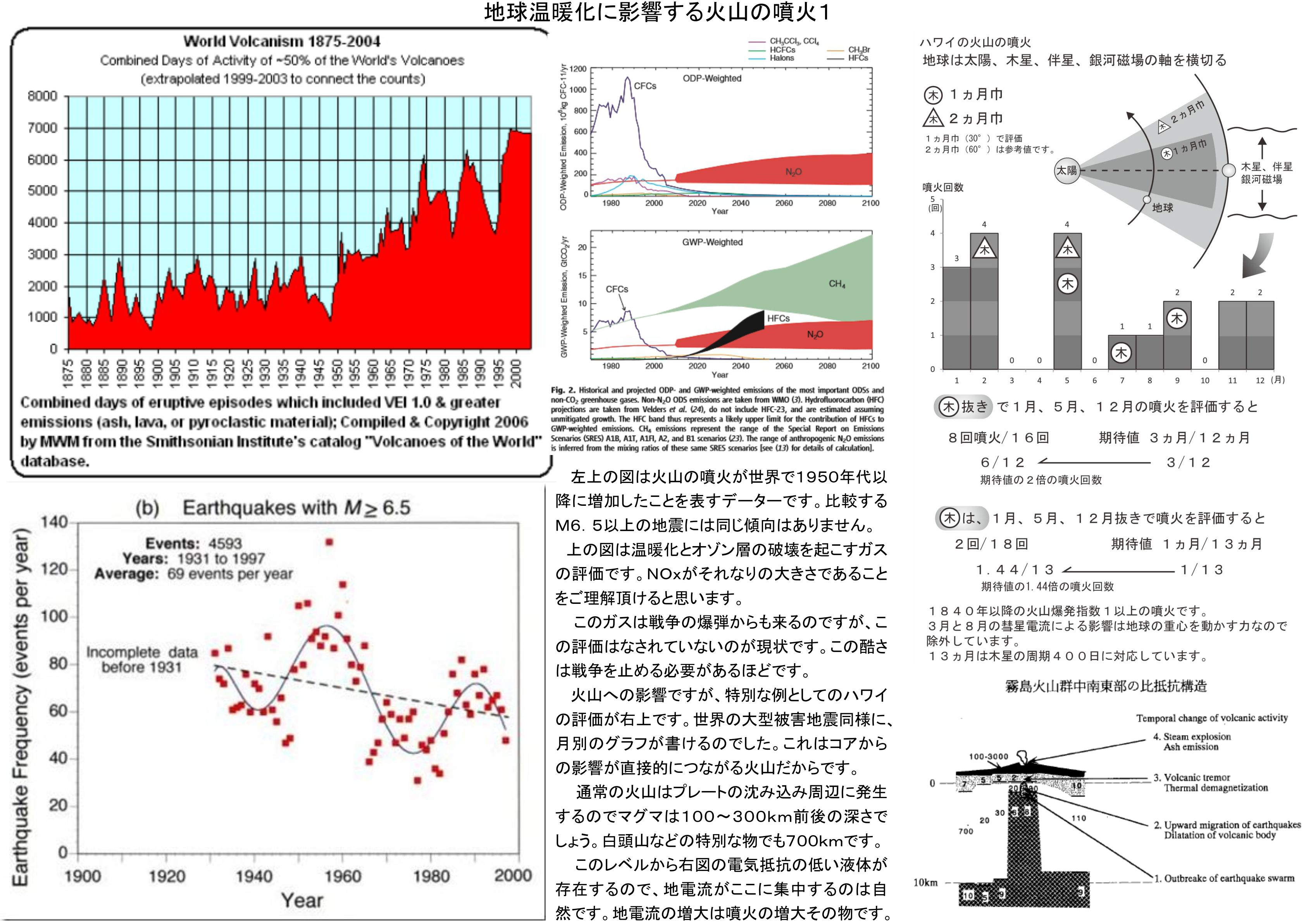 6)オゾン層は極域での破壊が進んでおり、これに対応して極域の地電流は増大し、南極などでは噴火も地震も過去よりも増えていることになる。それぞれが極域の温暖化を加速しており、氷河を溶かすのみならずメタンガスなどの温暖化ガスの発生を増やしており、既にこの増加による温暖化の加速が心配されるほどになっている。メカニズムは理解されていなかったが、現象は進展していたと言う状況が明確である。