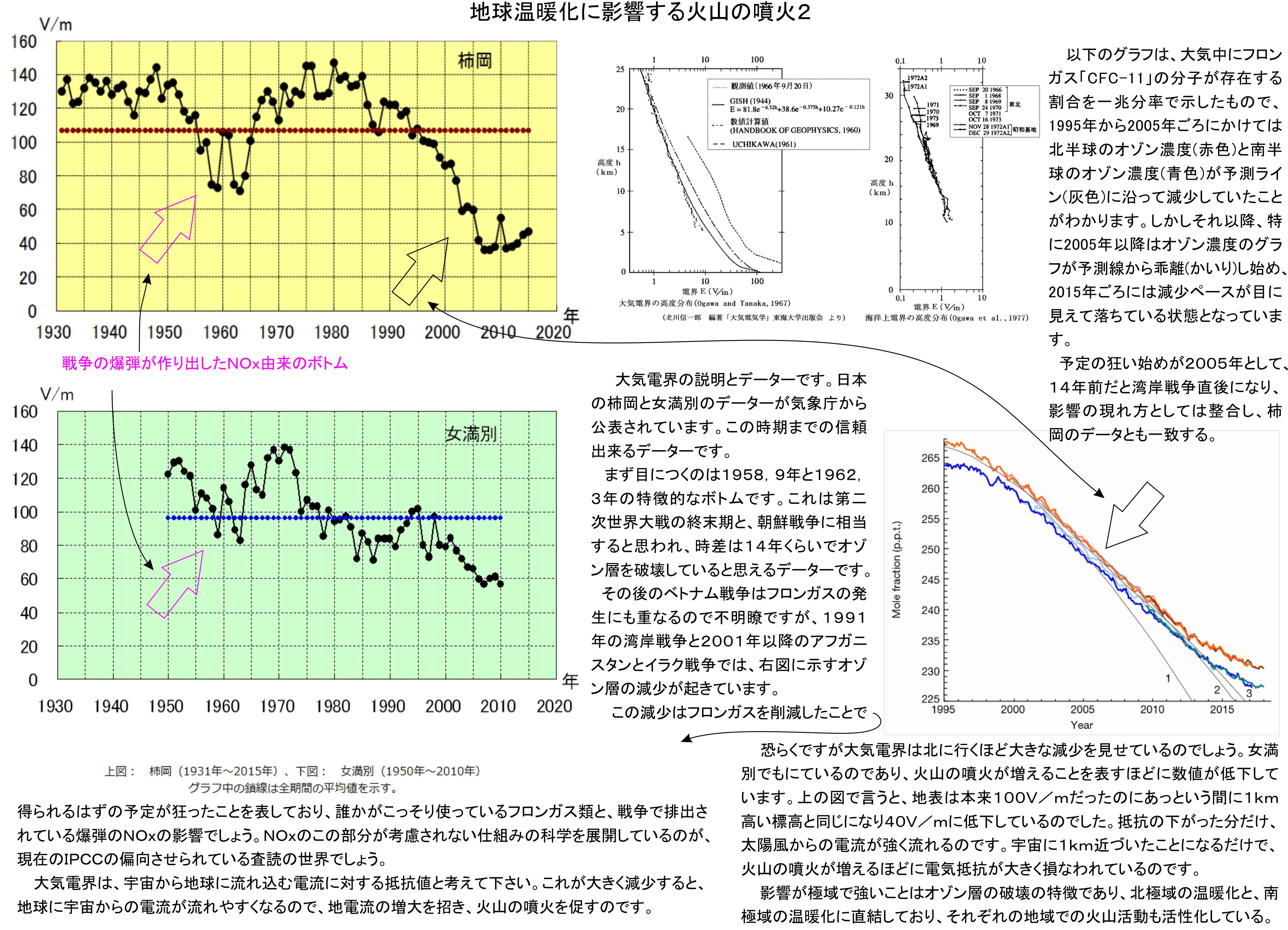 私たちはオゾン層の破壊で紫外線が増えて困るという認識ですが、これにとどまらずオゾン層の破壊により50km以上の上空の熱圏にあるプラズマが、オゾン層のガードが薄くなって30kmとかまで下に降りてきており、その分地球に電流が流れやすくなっているのでした。これは明確な物理なので、フロンガスとNOxの双方に対処が必要です。オゾン層が薄くなると、地球の熱圏に対する電気抵抗が低下するのであり、結果は主に太陽からの電流の増大としての噴火の増大なのです。
