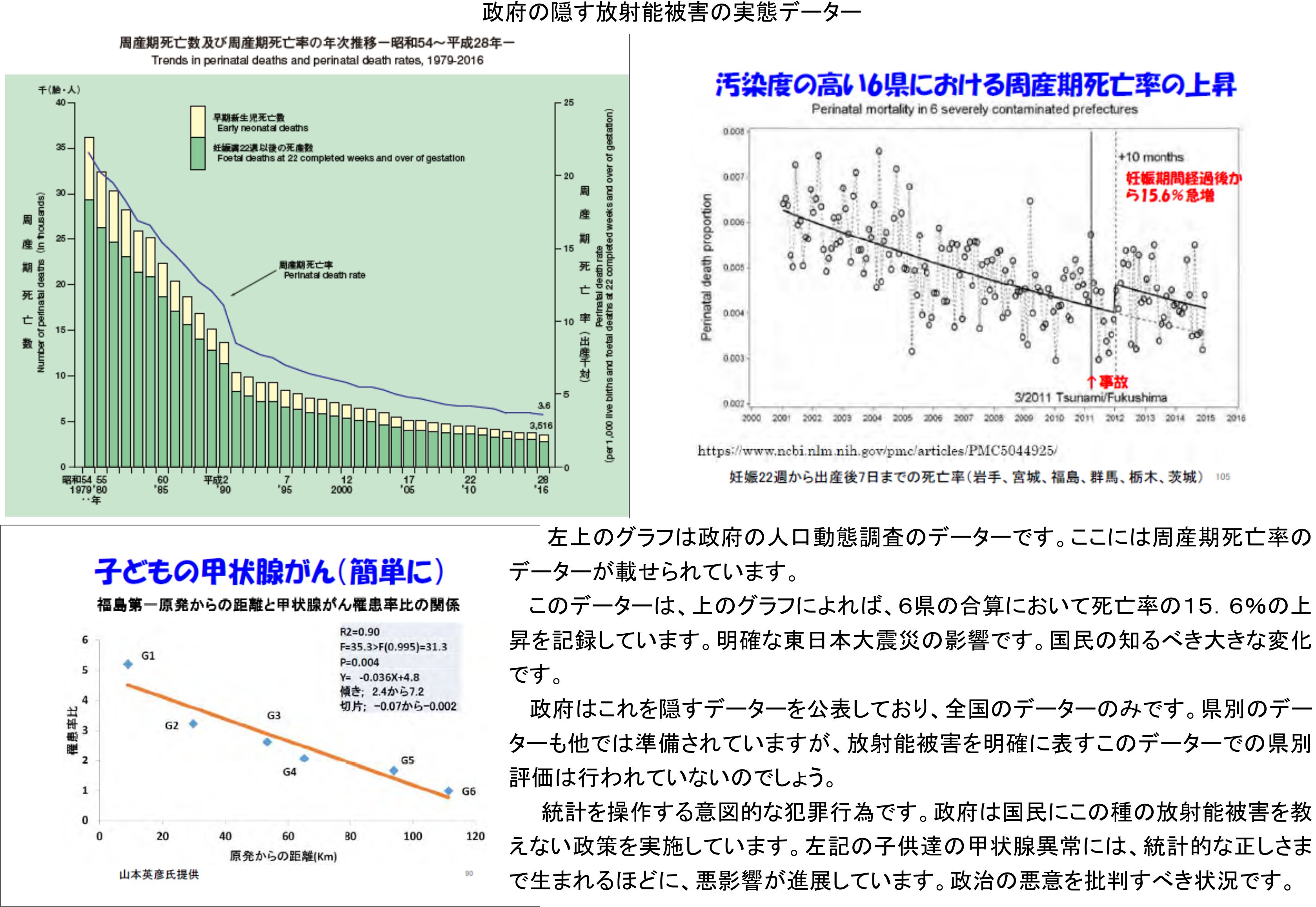 甲状腺がんについては詳細な議論をしていませんが、白血病の10倍だけでも十分な被害データーでしょう。低レベルの放射線は安全といいながらも、現実に起きてくる問題を隠すために、統計の隠蔽までを行ったのです。
