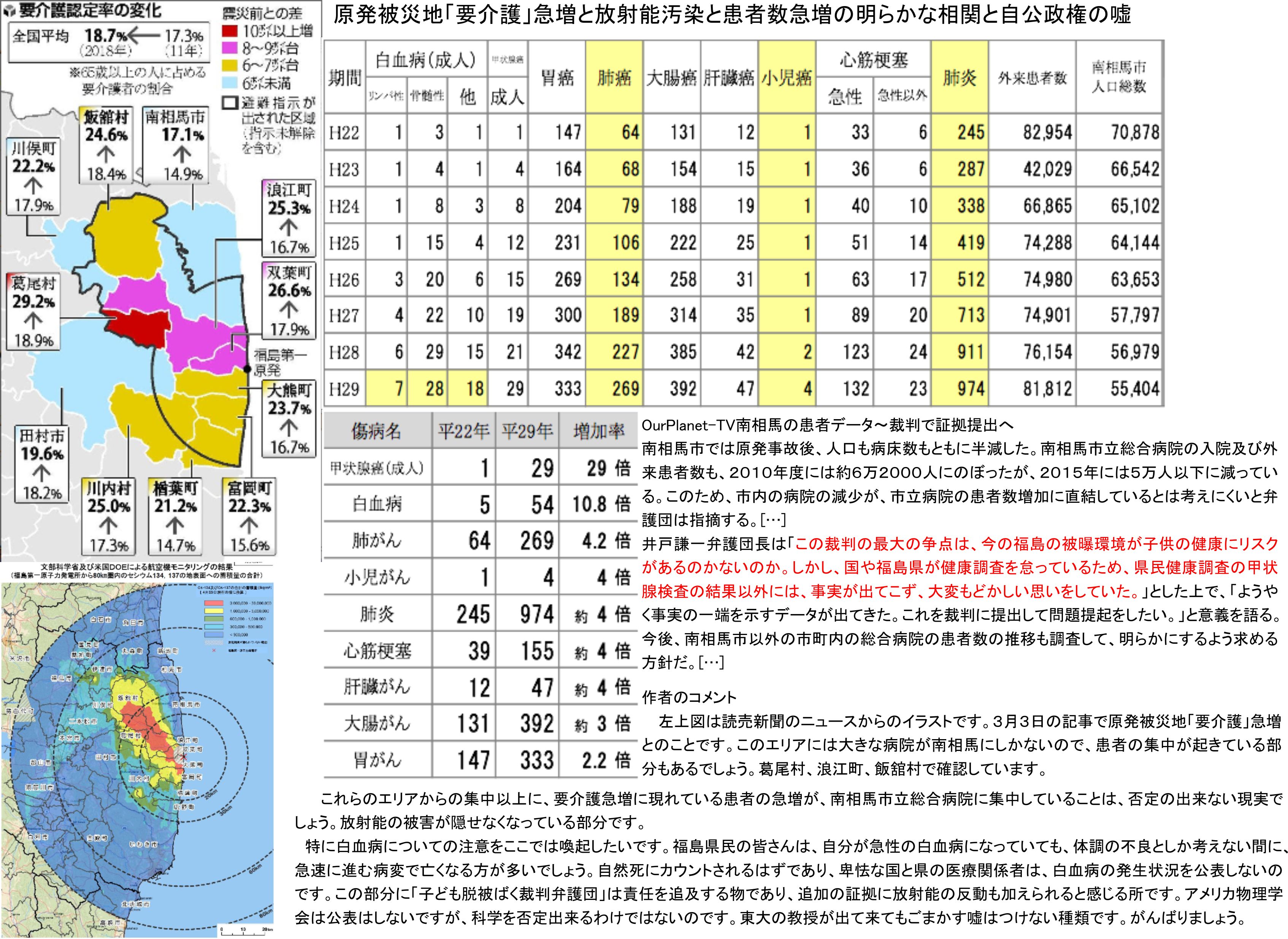左上図はご紹介済みの3月3日の読売新聞の記事からのデーターです。多い場所で10%も要介護率が上昇しているのです。読売新聞は放射能汚染との関係を全く触れないのですが、左下の放射能汚染図から明らかなように、誰が見てもここに相関を感じられるでしょう。汚染の大きいところほど、介護率が急上昇しているのです。当然これらは死者数にも反映するはずなので、政府の人口動態に現れている、年間数万人の自然死の増加部分に含まれるでしょう。