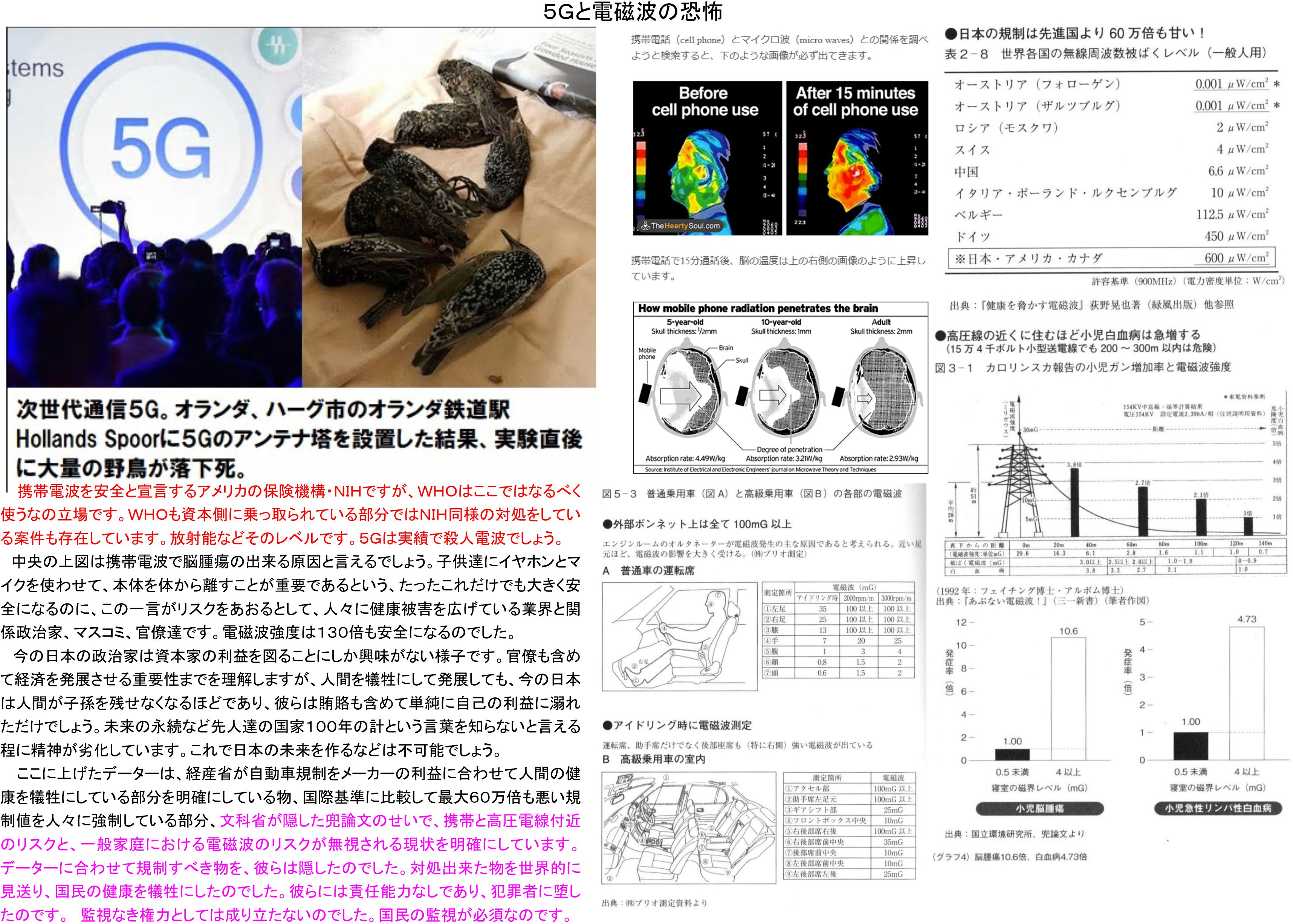 日本でも事態は同じであり、携帯各社の5Gへの投資は、日本の自然災害で国民が被害を受ける事になるでしょう。文科省の隠したEMFの問題に国民が向き合い、携帯各社の今後の投資を監視することが必要でしょう。健康被害につながる部分は停止措置や、既存の電波塔周辺への賠償措置など検討が必要になるでしょう。