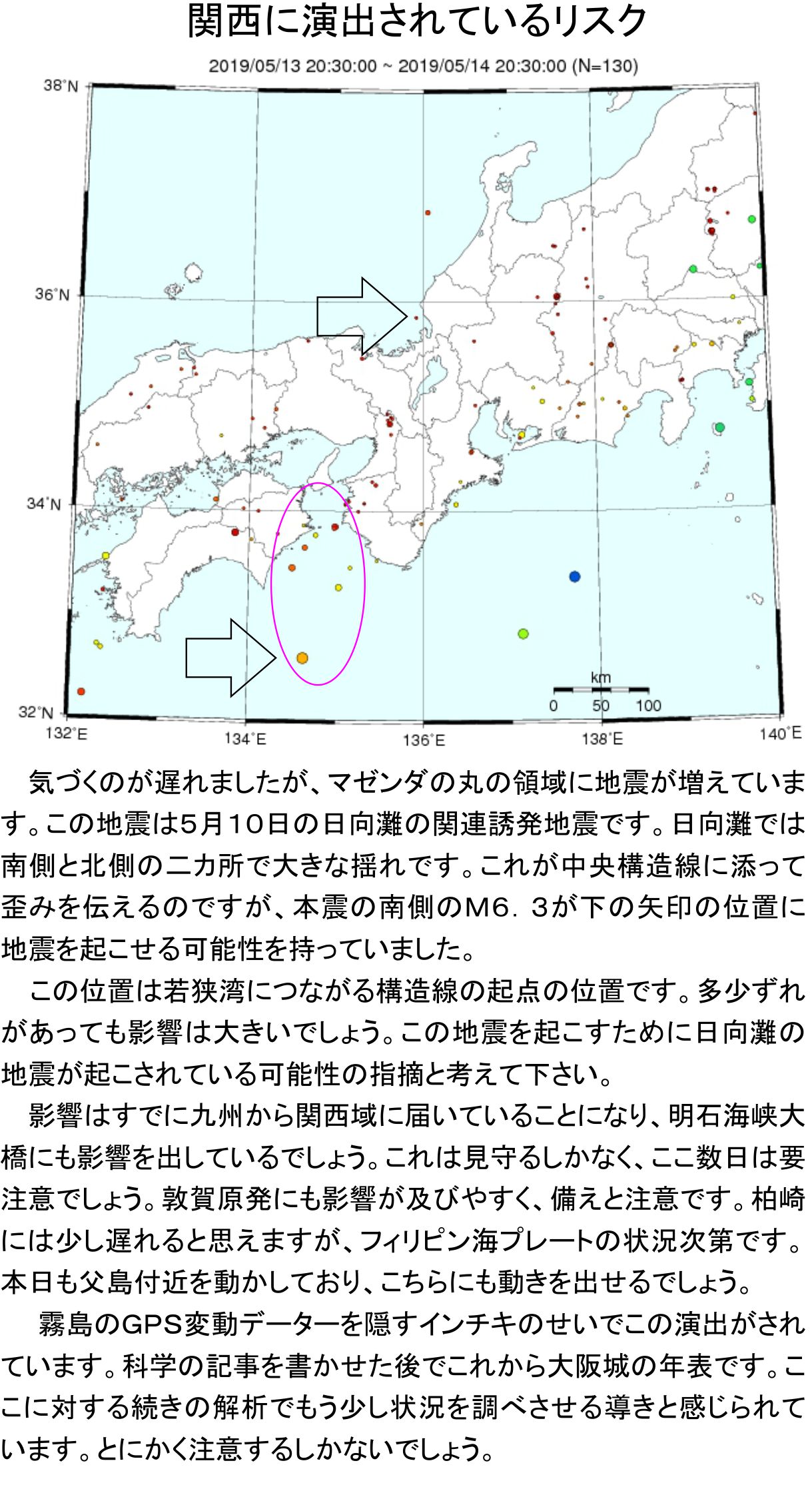 地震科学の側面ですが、気づくのが遅れましたが、イラストのマゼンダの丸の領域に地震が増えています。この地震は5月10日の日向灘の関連誘発地震です。日向灘では南側と北側の二カ所で大きな揺れです。これが中央構造線に添って歪みを伝えるのですが、本震の南側のM6.3が下の矢印の位置に地震を起こせる可能性を持っていました。