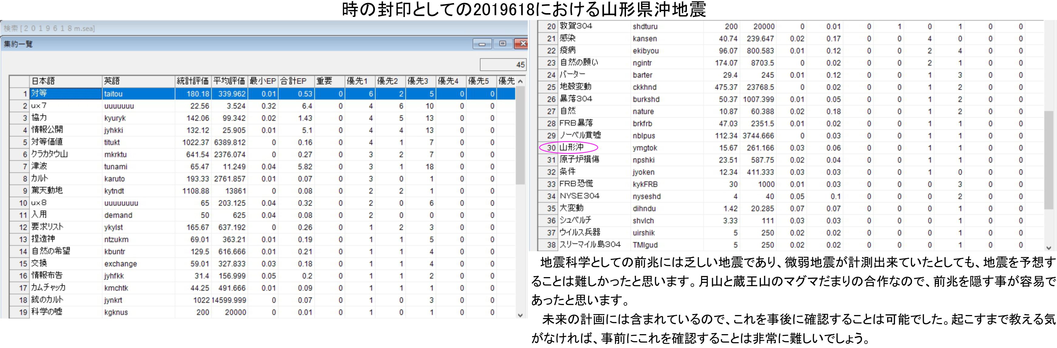 暗号解析の側面の説明です。まずはメインキーワード2019618に山形県沖地震が含まれているかを確認しました。含まれていれば時の封印が解けただけであり、予定通りに山形県沖に地震を起こしたことになるのです。イラストを参照下さい。山形沖として組み込みが確認出来るだけでなく、30番目ではありますが、予告のある場所を含んだ比較では上位に来るのでした。キーワードは確率的に出にくい6文字を選んでこの状況ですので、あらかじめあとから分かるようにする目的での時の封印です。