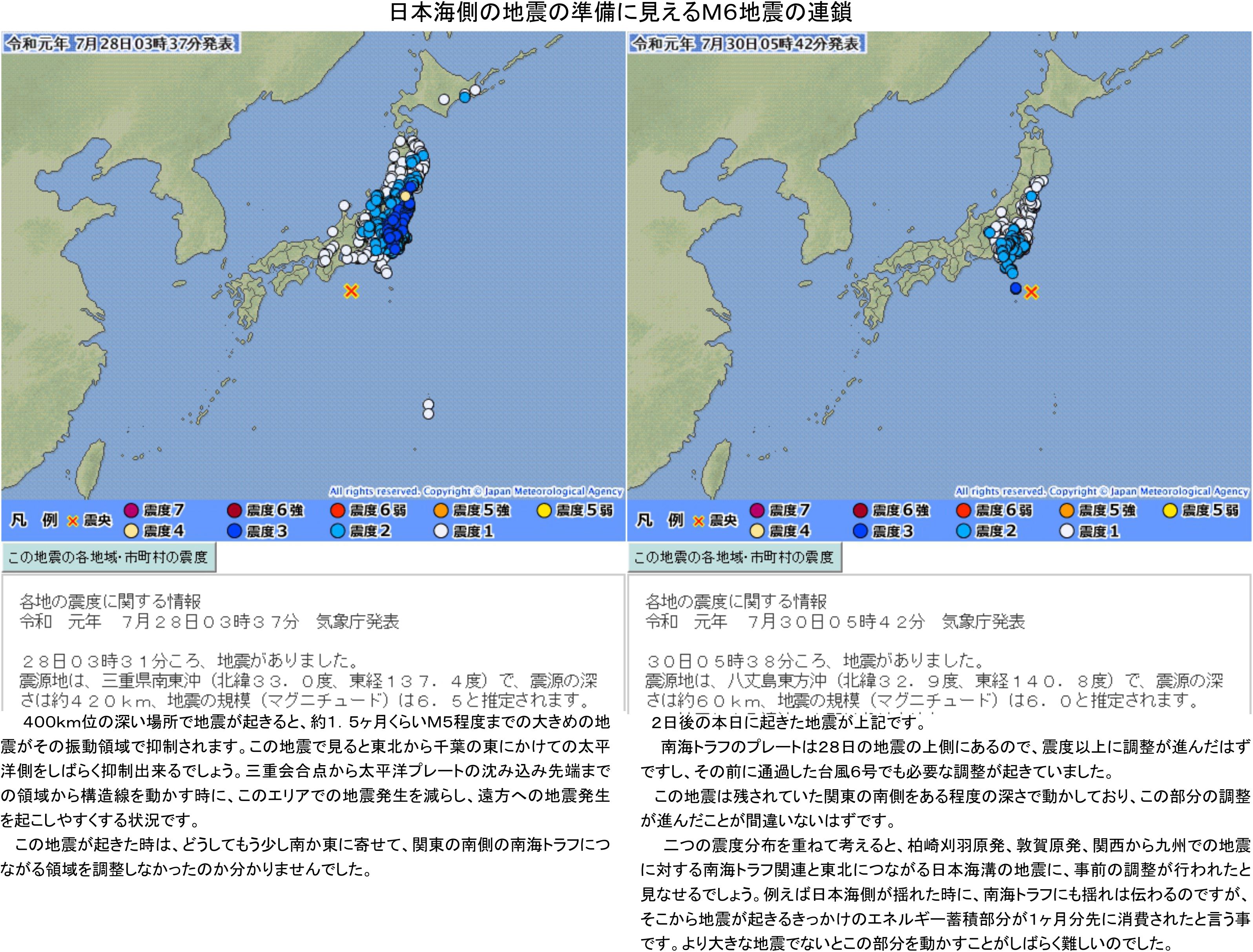 5時38分に八丈島東方沖でM6.0深さ60kmの地震があり、解析対象に加えて28日の三重県南東沖のM6.5深さ420kmの地震の影響との組み合わせで、日本海側に地震が起きた時に太平洋側の連鎖を防ぐ準備が進んだと思われます。イラスト参照下さい。