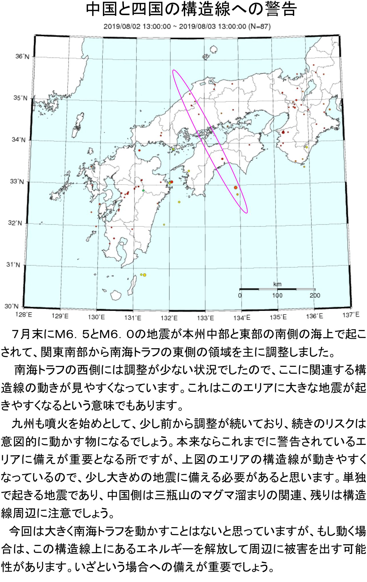 フィリピン海プレートの北上の動きが大きくなっているので、これに直接的に影響を受ける構造線として、四国の南側にある大型海山が起点である構造線の動きが大きくなっています。7月の2度の地震からは、少し距離があるので調整が不十分なのだと感じます。